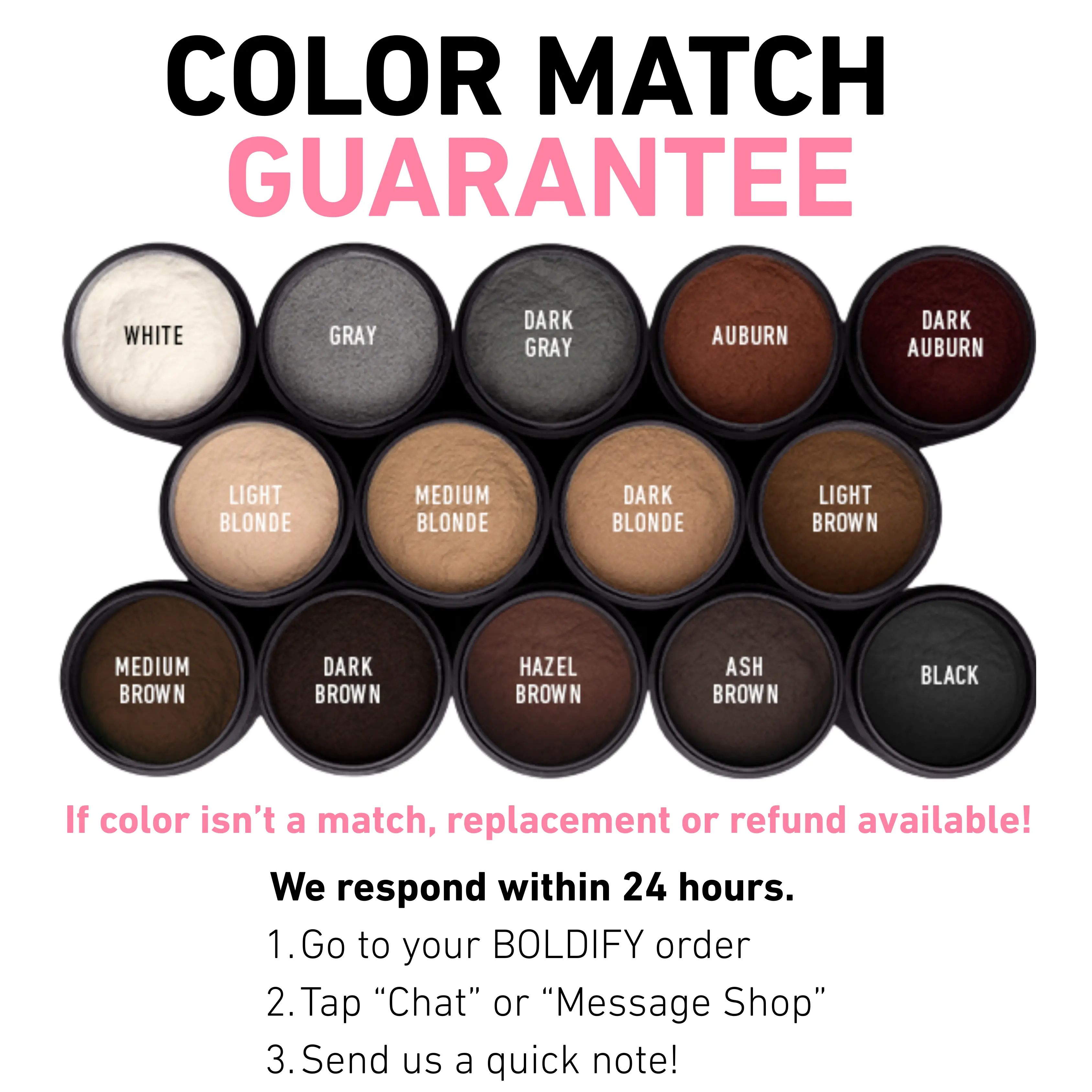 Our Hair Fibers are designed to provide natural-looking, buildable coverage for thinning hair when applied correctly and matched to the right tone. To help you find your perfect shade and get the best results, we offer a clear color wheel, step-by-step application guidance, and a Color Match Guarantee with free replacement or refund if your shade isn’t right.