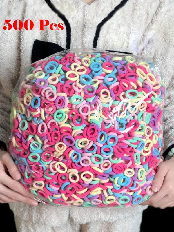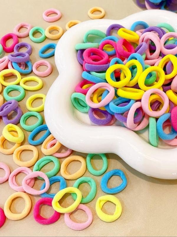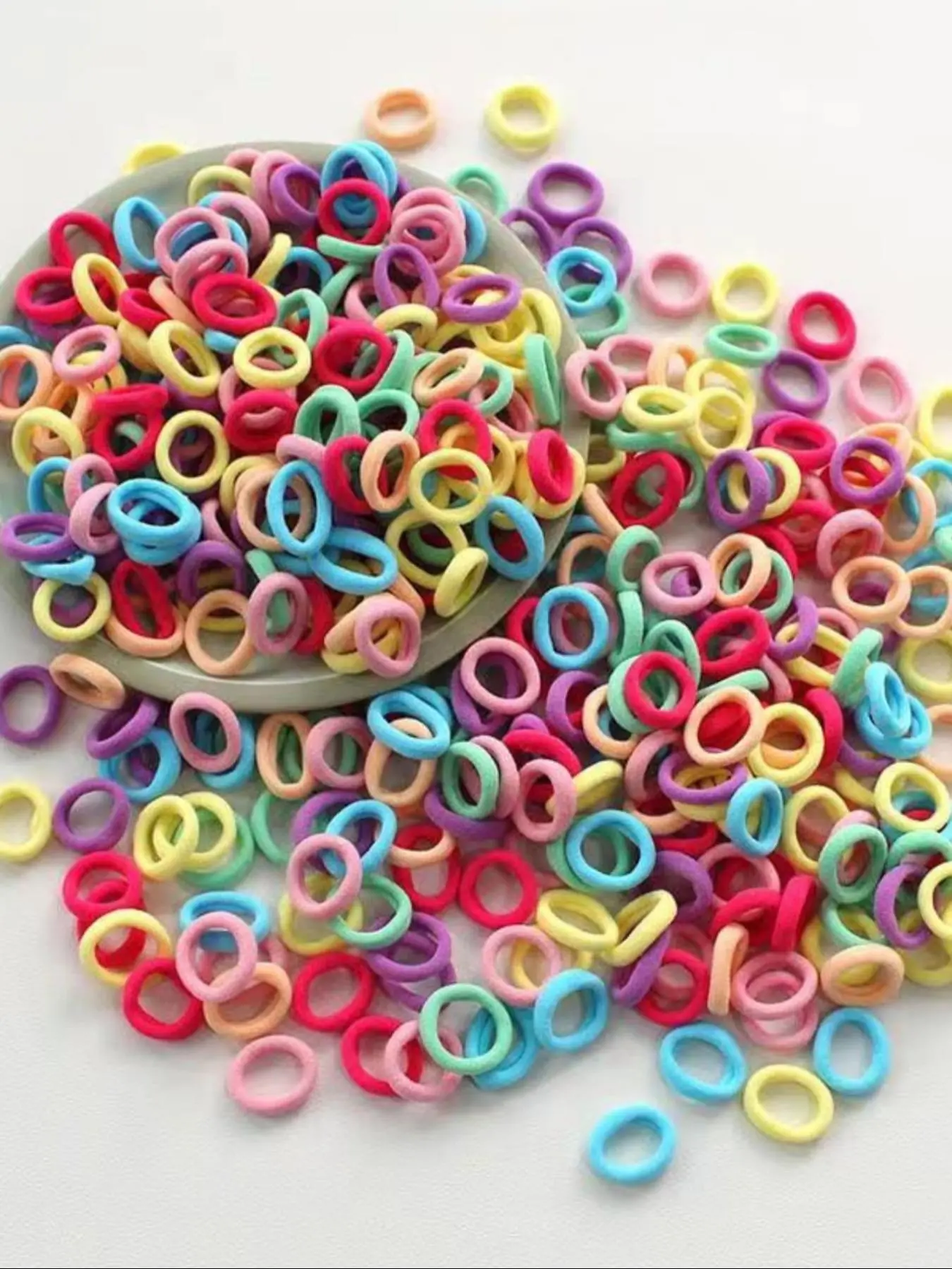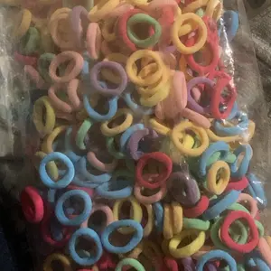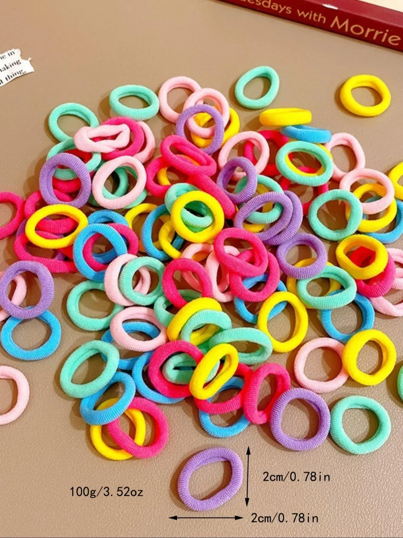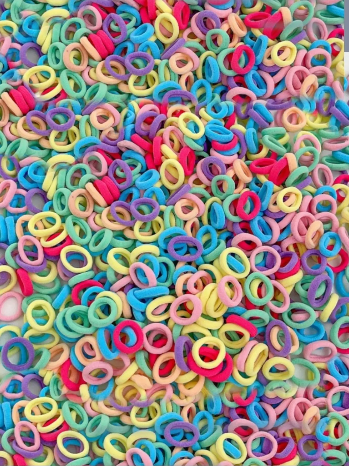 Color: Red, pink, hot pink,peach yellow teal , light green, light blue, light purple, are some of the colors plus very small so you get so many. This for us might last a month or two we lose so many I don't even know how but this is perfect you get so many. Very stretchy small elastic one size fits all