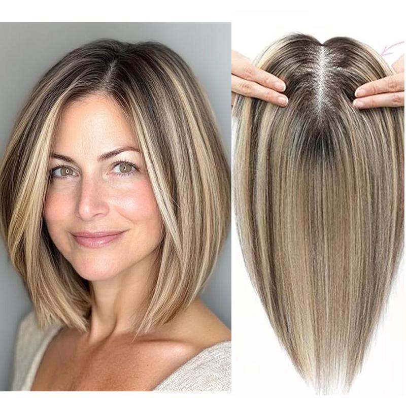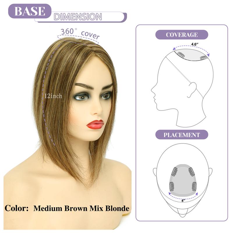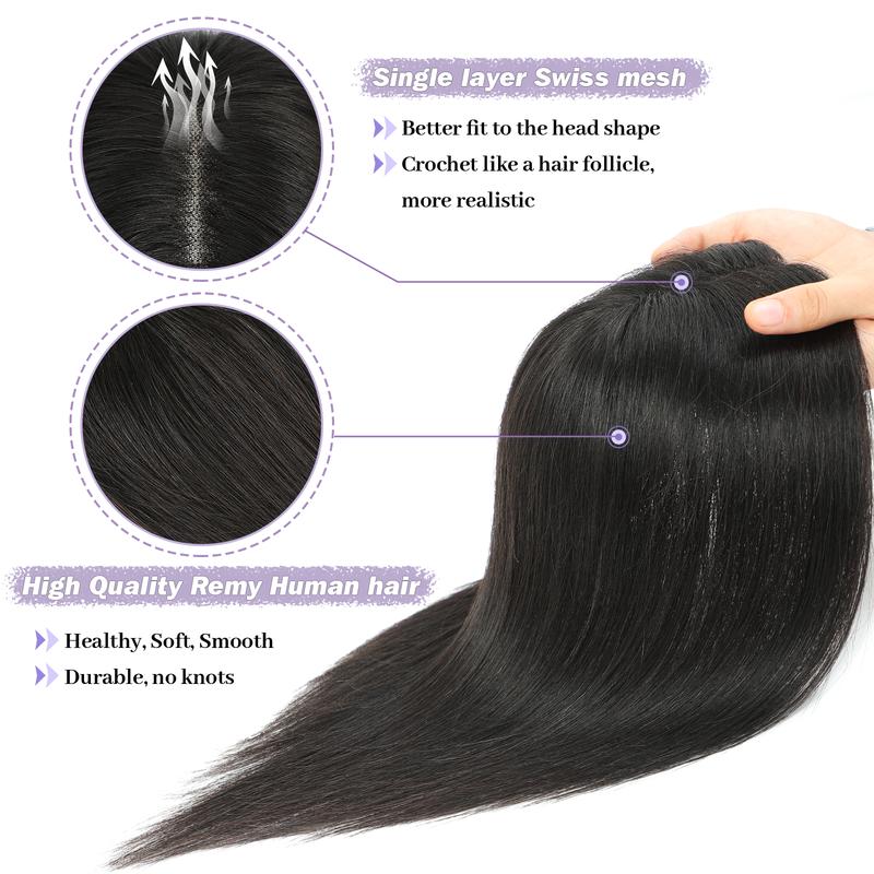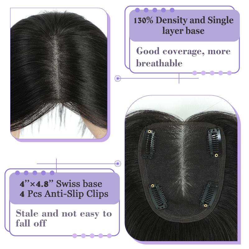 ·Real human Hair Topper :High quality remy human hair topper for women;Premium real human hair,healthy and soft,Shedding and tangle free,no synthetic mix. Blend well with your own hair. Can be washed, curled, straightened & dyed. Can be shaped according to your own needs.It is not suited for ladies in mid/progressive hair loss or bald top or need a thick cover