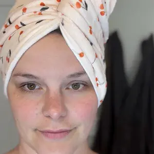 I love how comfortable this towel fits and how it secures so easily. My only issue is that my hair is longer than the towel so i had to tuck in my ends. Otherwise I love it. Love the cherry print and the material is very nice.