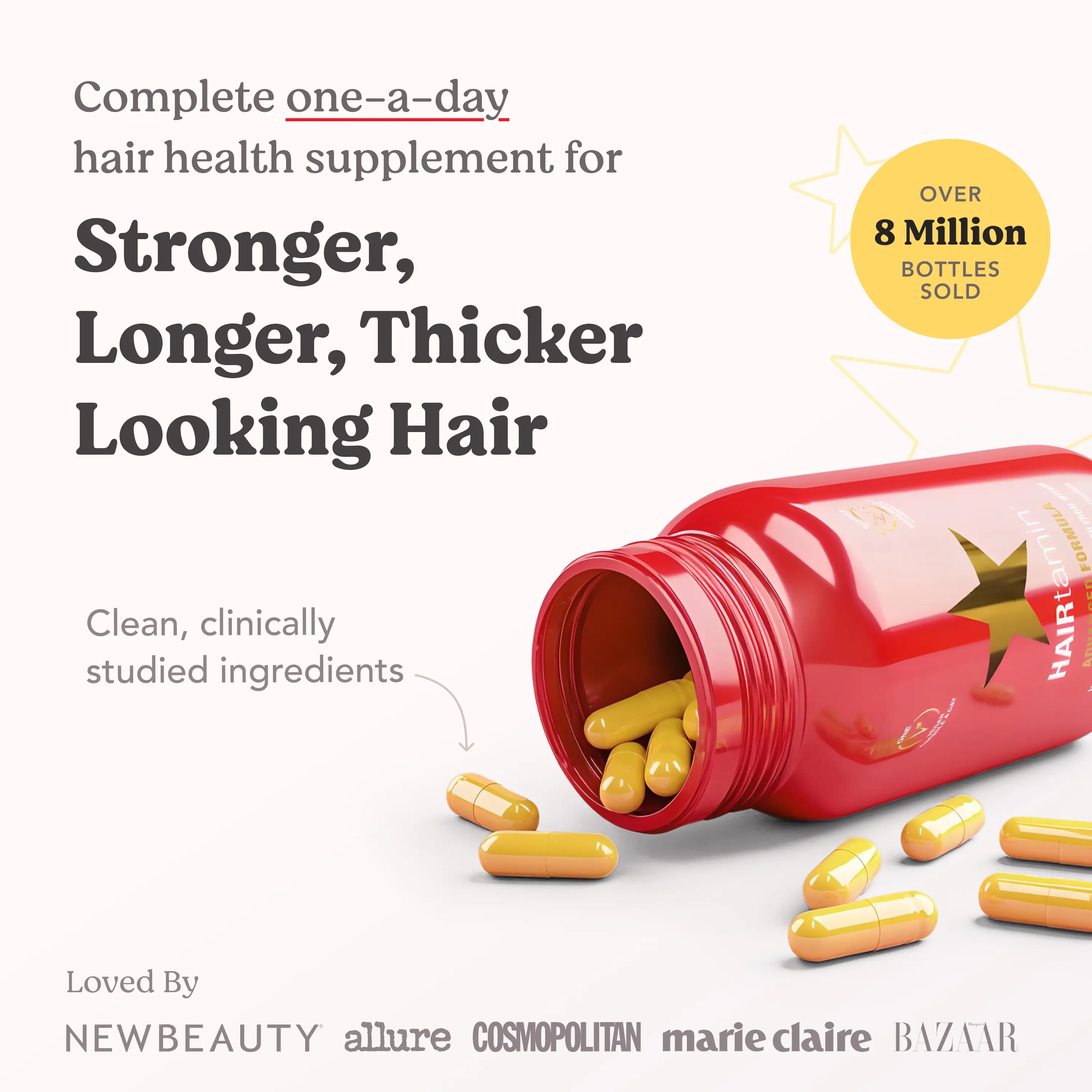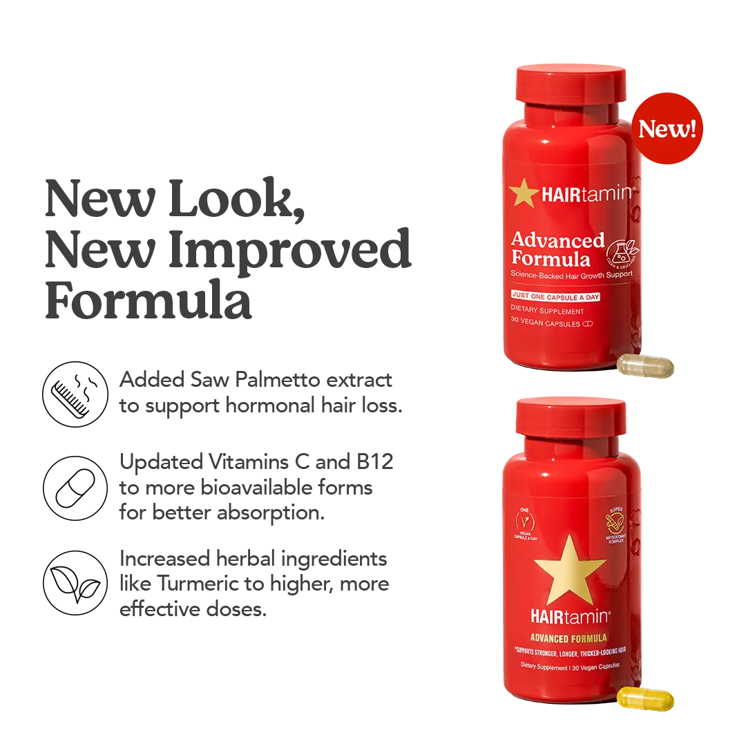 HAIRtamin Advanced Formula is a physician-formulated, clean, one-a-day, hair nourishing supplement with clinically-studied, vegan ingredients that help maintain stronger, longer, thicker-looking hair. Our proprietary blend of essential vitamins, minerals, and herbs, plus a potent antioxidant complex, work together to support healthy hair growth and follicle strength.