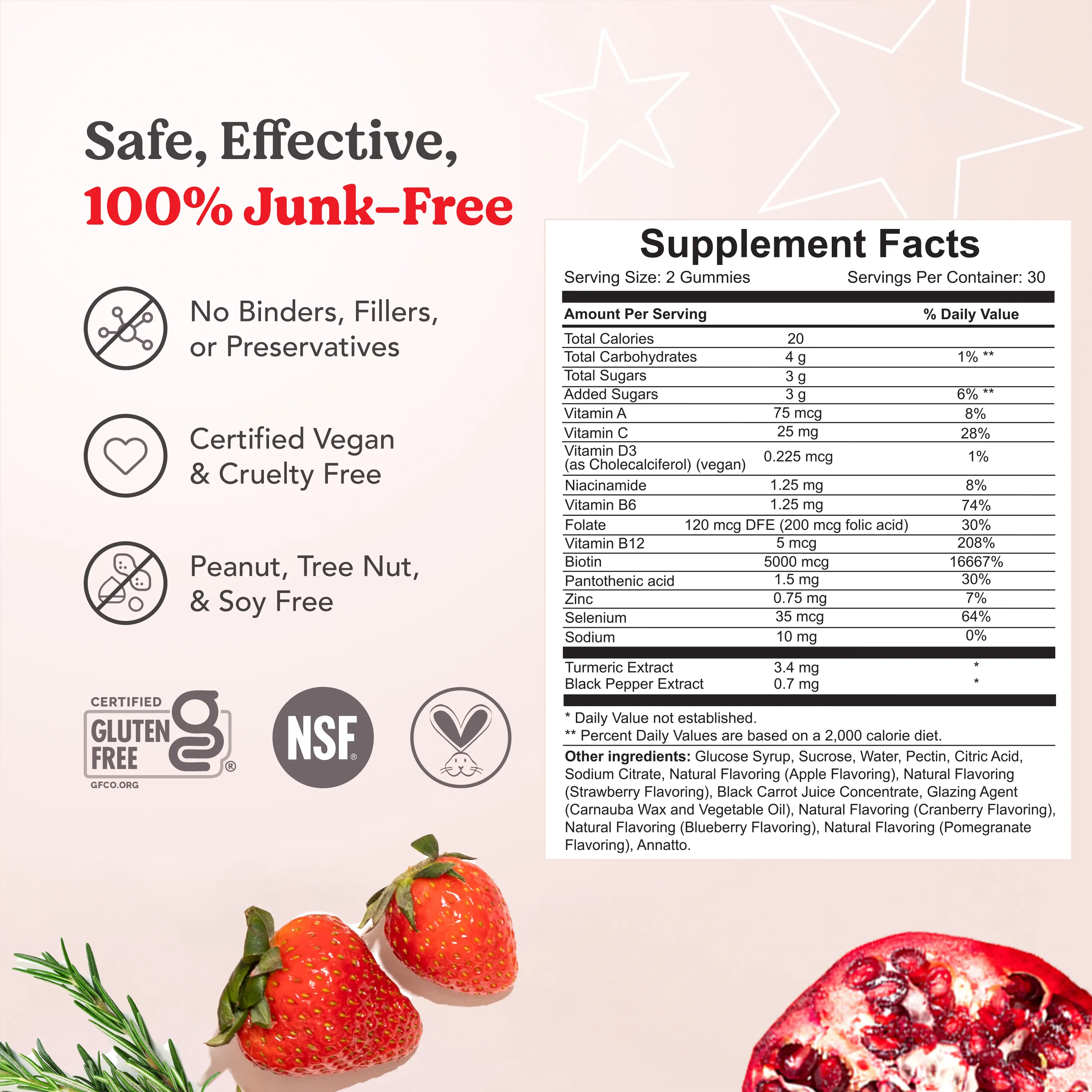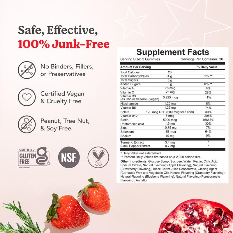 Ingredients: Powered by 5000 mcg of Biotin, this formula features a super antioxidant complex with Turmeric and Black Pepper, plus essential vitamins A, C, D3, B5, B6, B12, Niacinamide, Folic Acid, Zinc, and Selenium. Superfruits like Pomegranate, Strawberry, Apple, Blueberry, and Cranberry add nourishment. Helps support stronger, longer, thicker-looking hair.