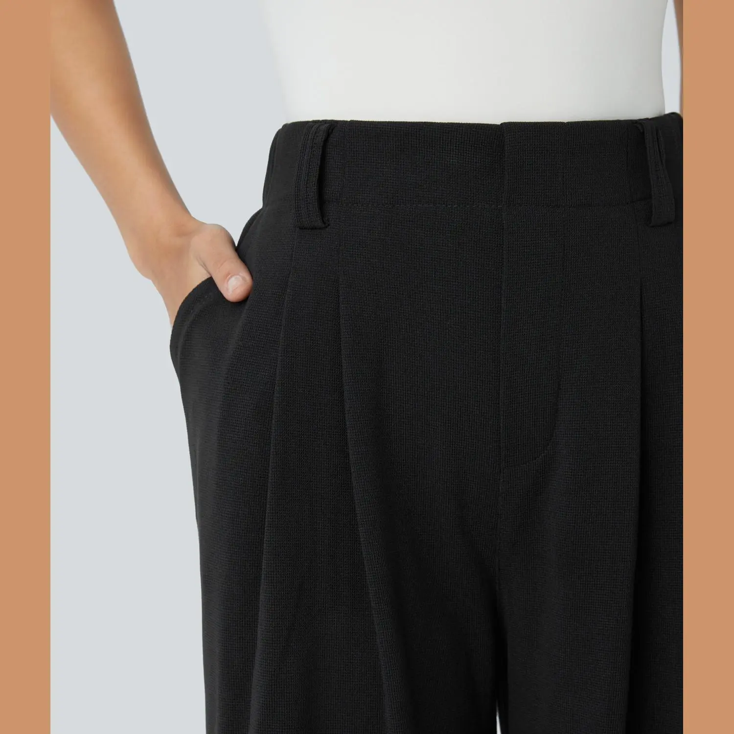 ·Features: High waist design that offers support & comfort, without sacrificing on style. Designed with plicated tailoring for a textured look. Featuring two side pockets for storing your essentials such as credit cards or other small items when you're on the go. Wide leg style gives a timeless look, while providing comfortable wear. Solid color designs that are simple yet effortlessly stylish. Waffle fabric provides loose comfort and gives added texture to your look. No zippers for a comfortable fit. Designed with 2-way stretch fabric.