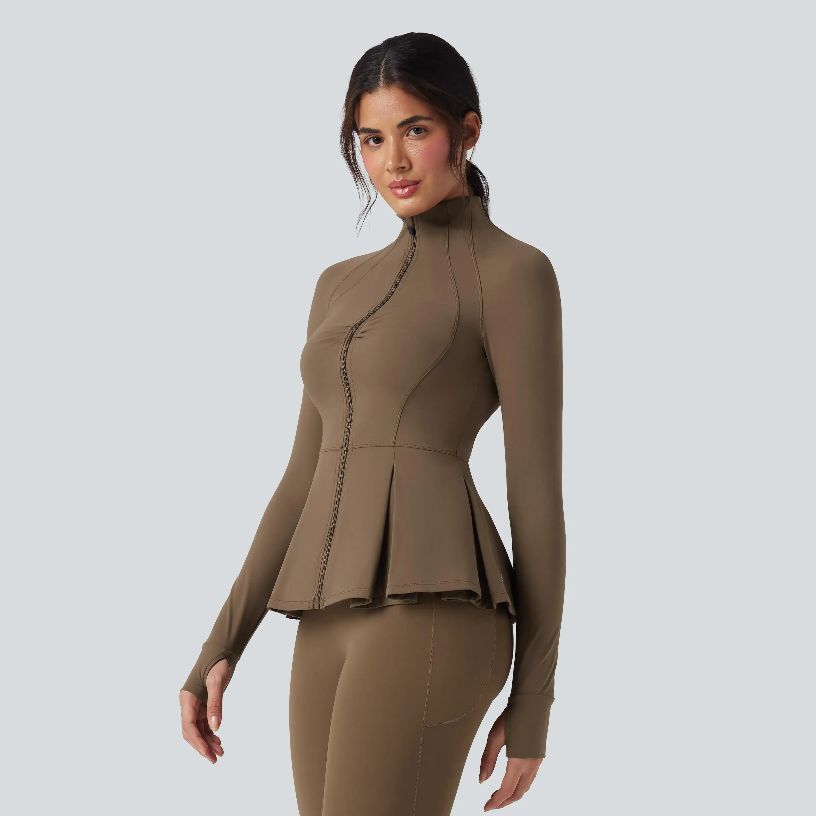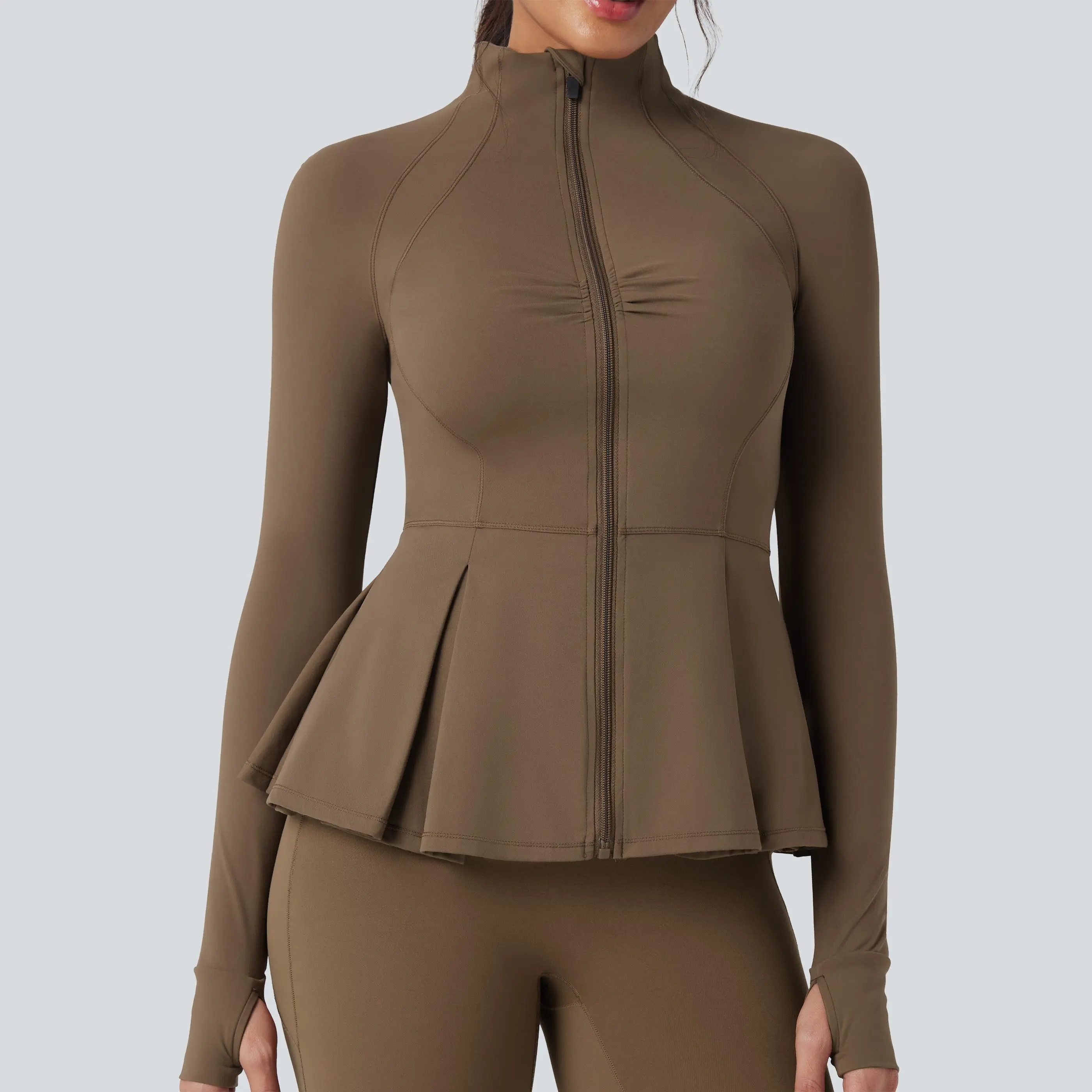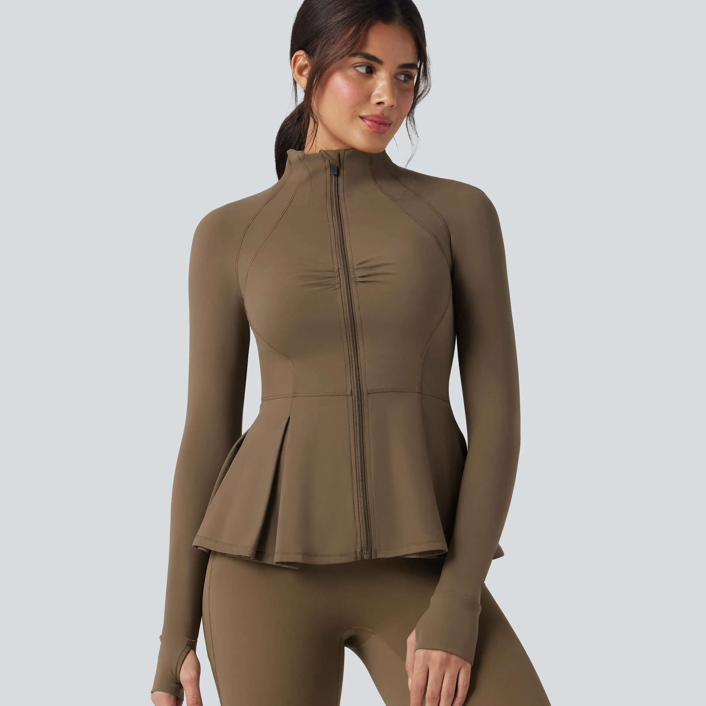5. Halara SoftlyZero Plush Mock-neck Thumb Holes Ruched Pleated Hem Slim Yoga Jacket