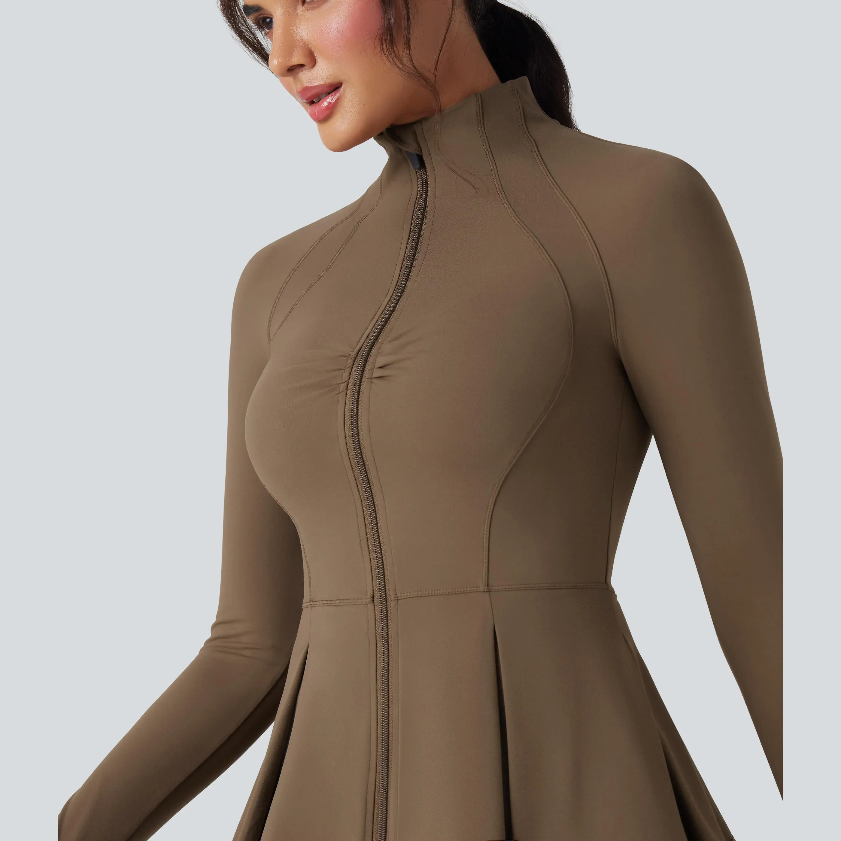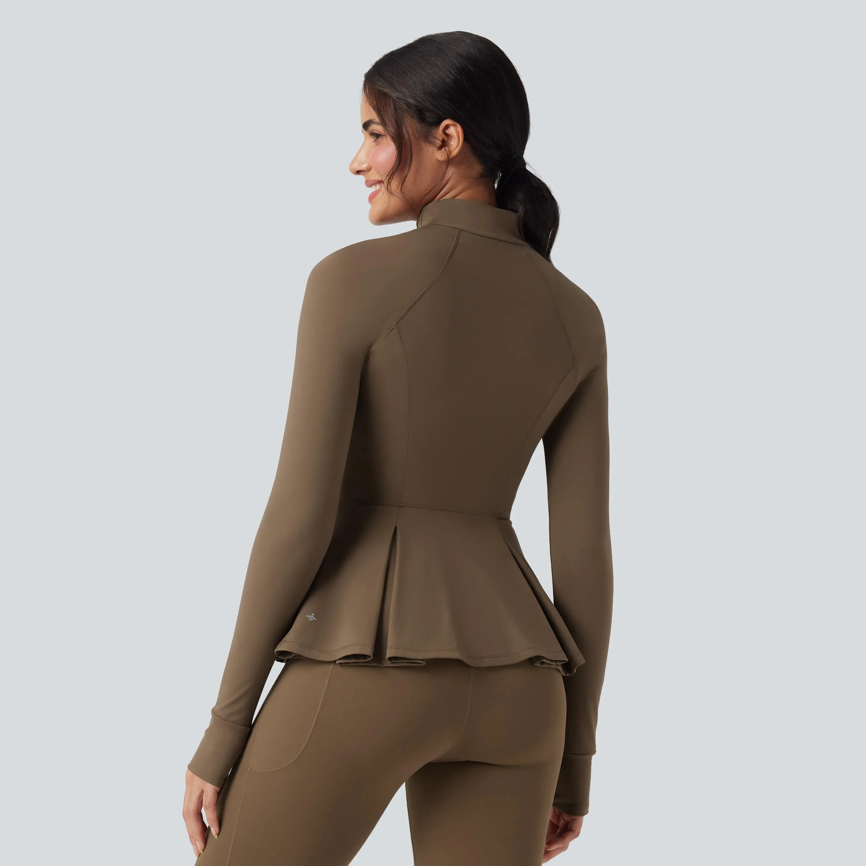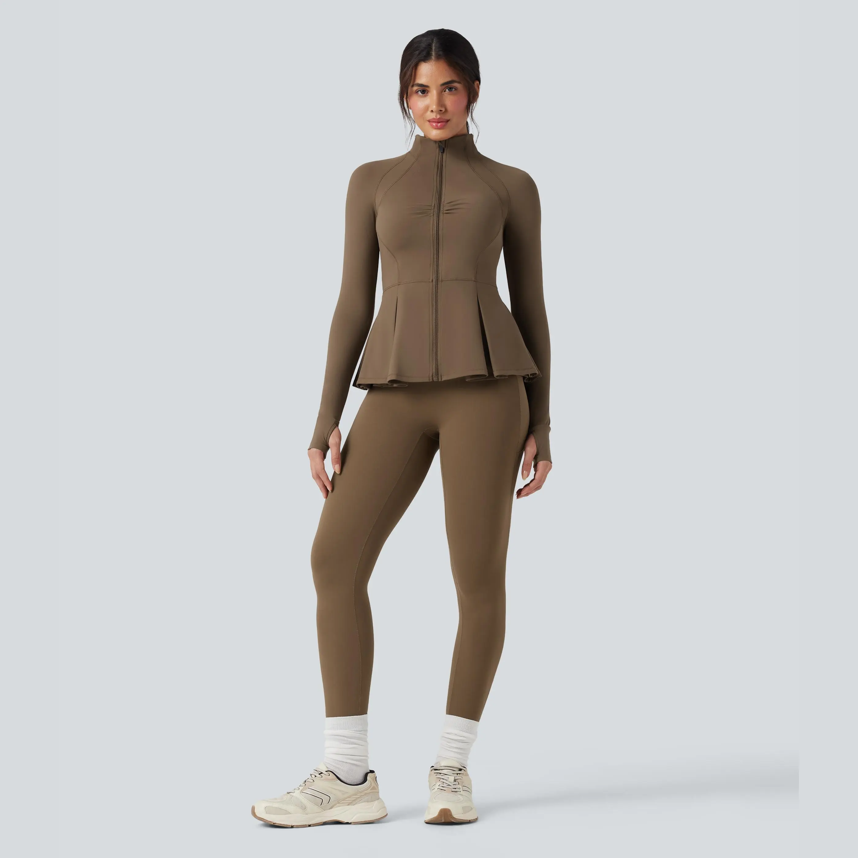 5. Halara SoftlyZero Plush Mock-neck Thumb Holes Ruched Pleated Hem Slim Yoga Jacket