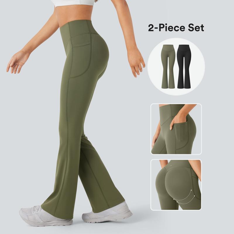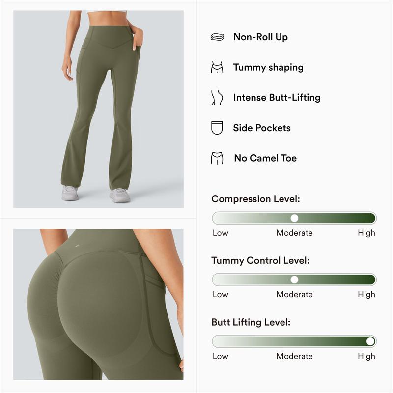 ·Features: Built-in booty lift: Offering extra support and accentuates booty shape with ruched seam, this fabric noticeably lifts the contours of the butt and glutes - achieving a ruched effect without the intensity of a scrunch, while its seamless and elevating construction flatters your figure without sacrificing comfort. High waist design that offers support & comfort, without sacrificing on style. Sandwich construction waistband with diamond-tip shape at the front giving you maximum tummy control benefit and that chic trimmed look. One pocket at each side to free your hands and keep your essentials close. Slight flare design to create a leg-extending silhouette, for a streamlined look. Feel held in and pumped in our new cool-touch 4 way stretch Power Magic fabric for greater comfort and full range of motion. No front crotch seam and double layered gussets assures you zero camel-toe problem. Streamlined side and back seams perfecting your curves all around. Sleek soft with just the right amount of compression, sweat-wicking and highly breathable, enjoy workouts with no limitation. Four-way stretch fabric offers ease of movement and durable wearability.