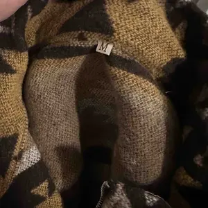 I would size up as the material does not have any give to it. Someone made a comment that it's soft. It's not, at least to me. It's itchy like wool but has a rougher texture.It's not warm. Wind blows right through it. Can see my ceiling light through it in one of the pictures. Print is nice though.