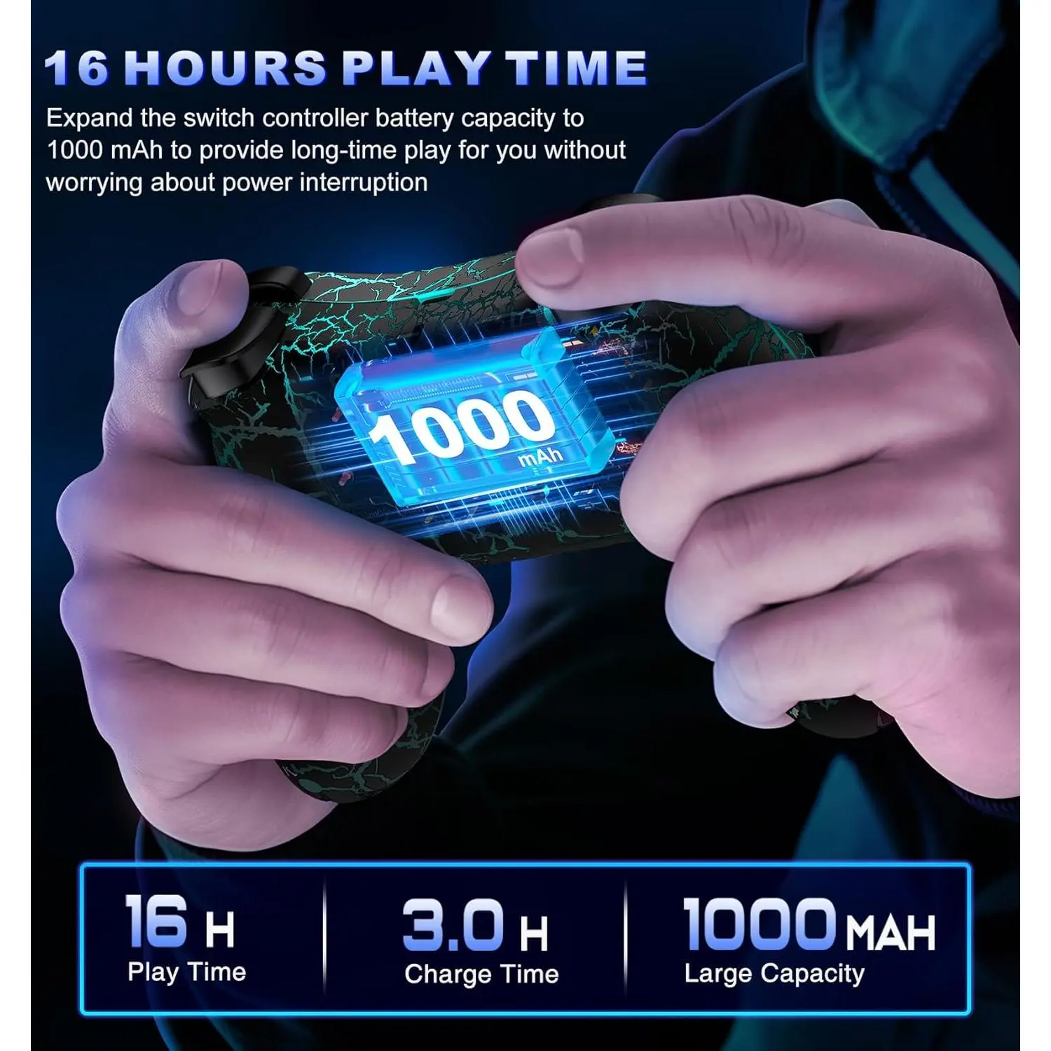 1000mah Battery Capacity: To meet players’ gaming time needs, we increased the battery capacity of the switch controller to 1000mah, which is twice the capacity of other controllers. The package includes a UBS-C charging cable, and a 3-hour charge can last about 12-16 hours, even with the light effect on can also ensure longer game length (play time used without the light effect will be longer)
