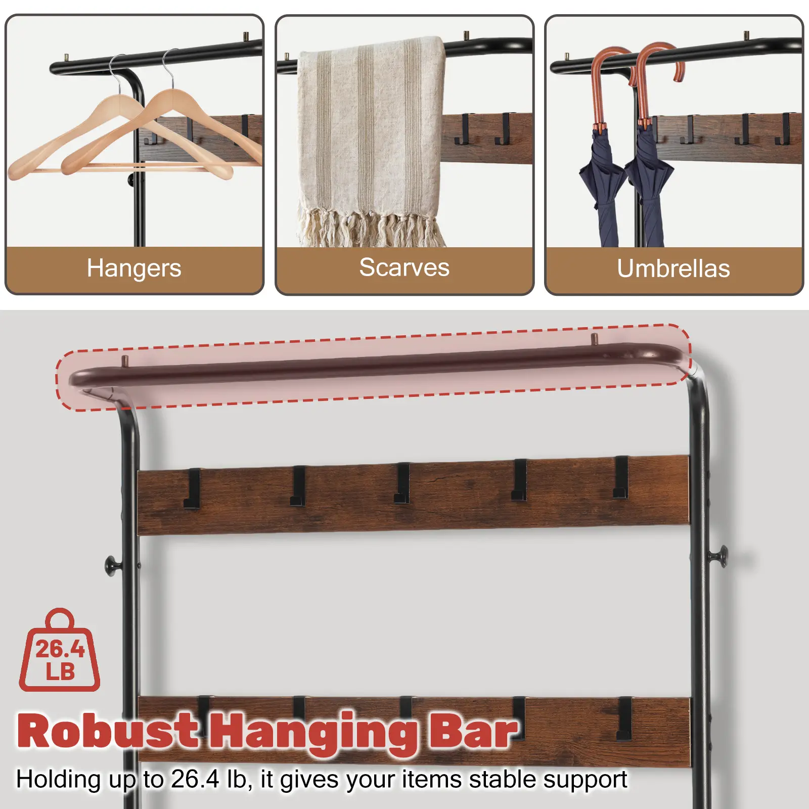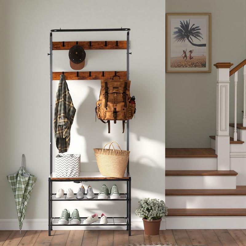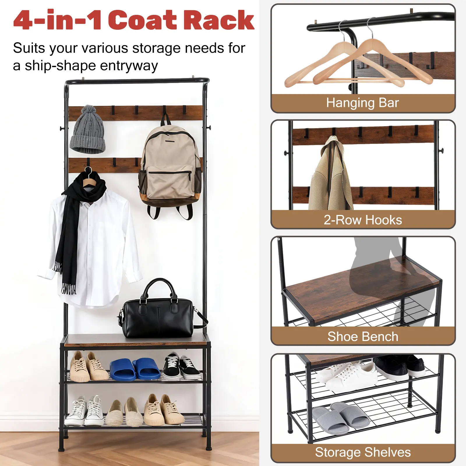 ·This all-in-one freestanding coat rack combines a hanging rod, shoe bench, shoe rack, and coat hooks. It offers convenient storage for coats, shoes, and on-the-go items. The bench provides a seat to change shoes. Perfect for entryways, it maximizes vertical space.