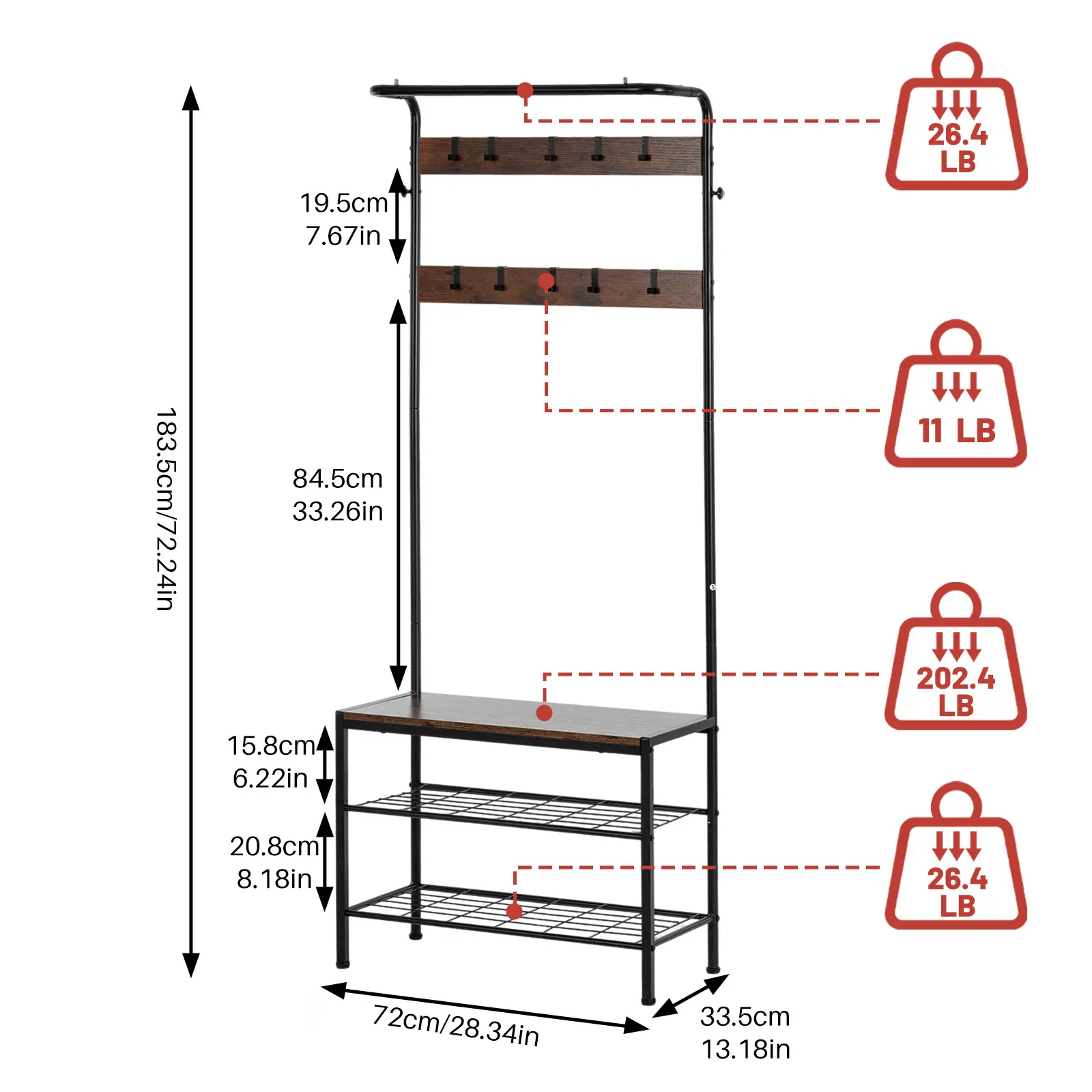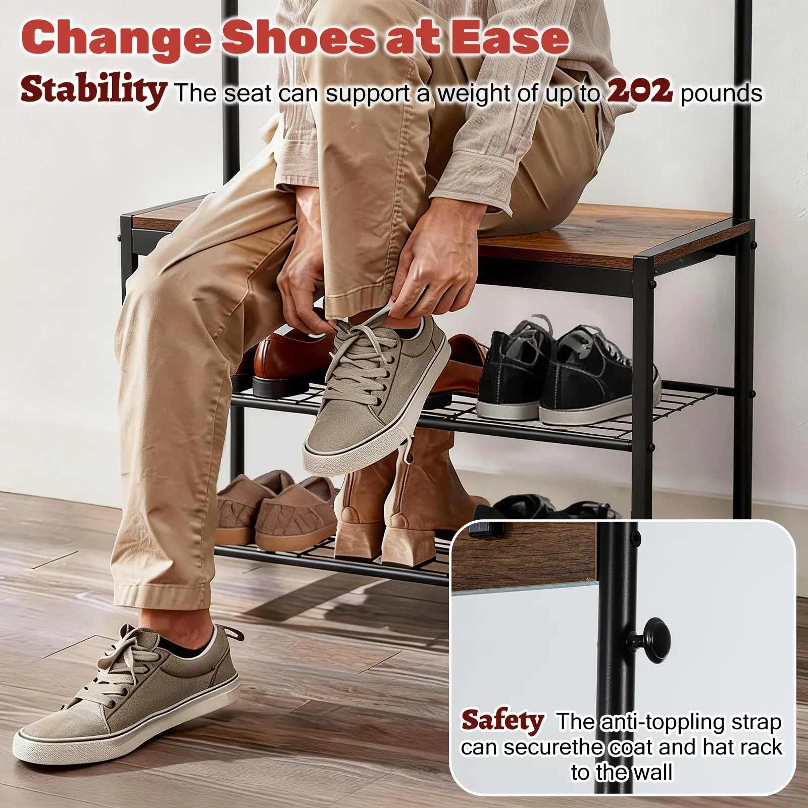 ·The sturdy steel frame and quality particleboard create a robust coat rack. The shoe storage bench supports up to 198 lb, ensuring you can sit with peace of mind. The anti-tip kit adds to the stability.