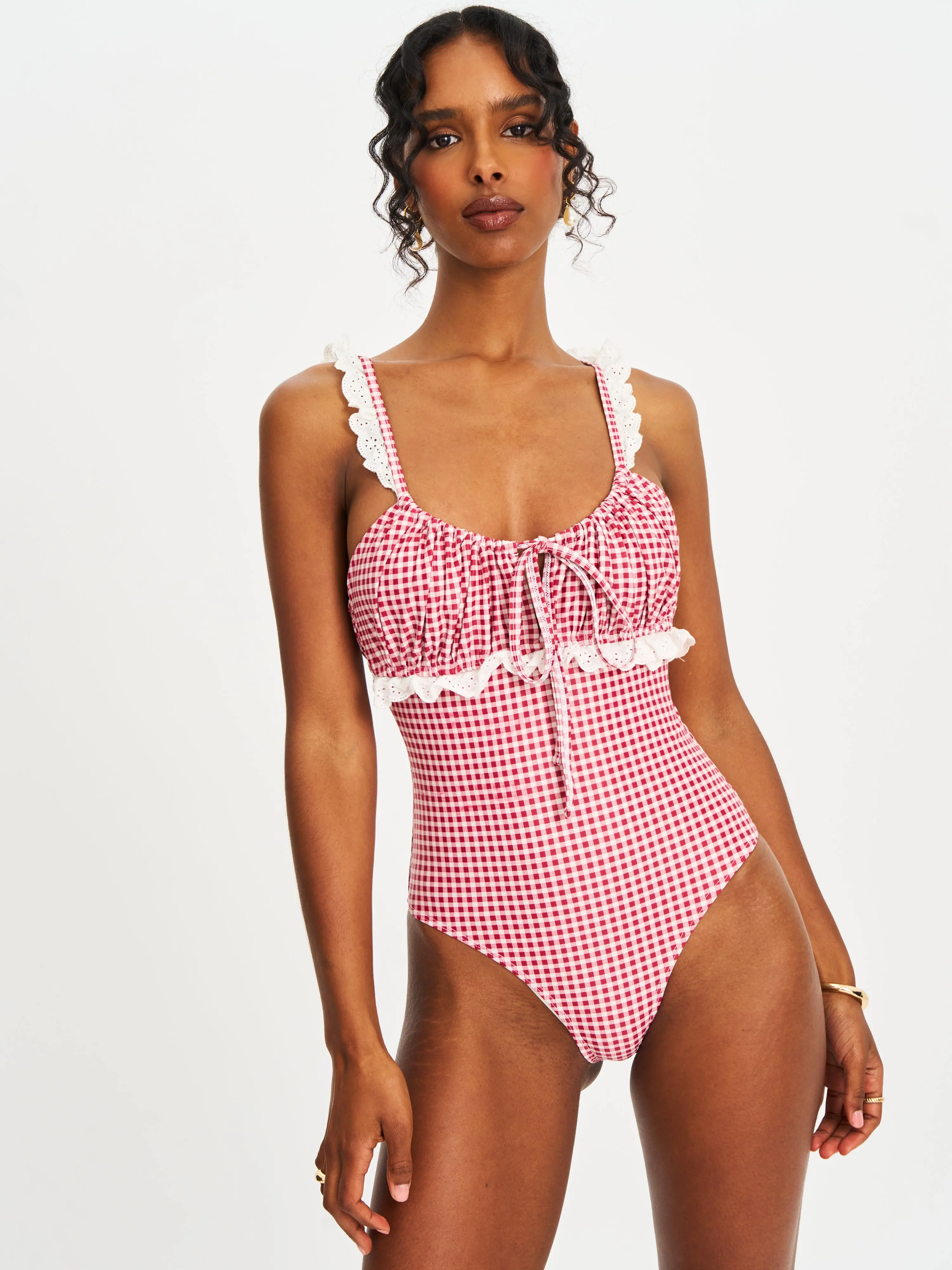Meet the Hallie Swimsuit—a charming blend of vintage flair and modern elegance. Designed in a vibrant red gingham print, this one-piece features delicate cotton eyelet lace decorations and romantic lace trims that elevate its feminine appeal. The backless silhouette with a lace-up detail ensures a flattering fit and a touch of allure. Fully lined for comfort and confidence, Hallie is perfect for sunny vacations, beachside lounging, or poolside chic moments. A must-have for your summer wardrobe.