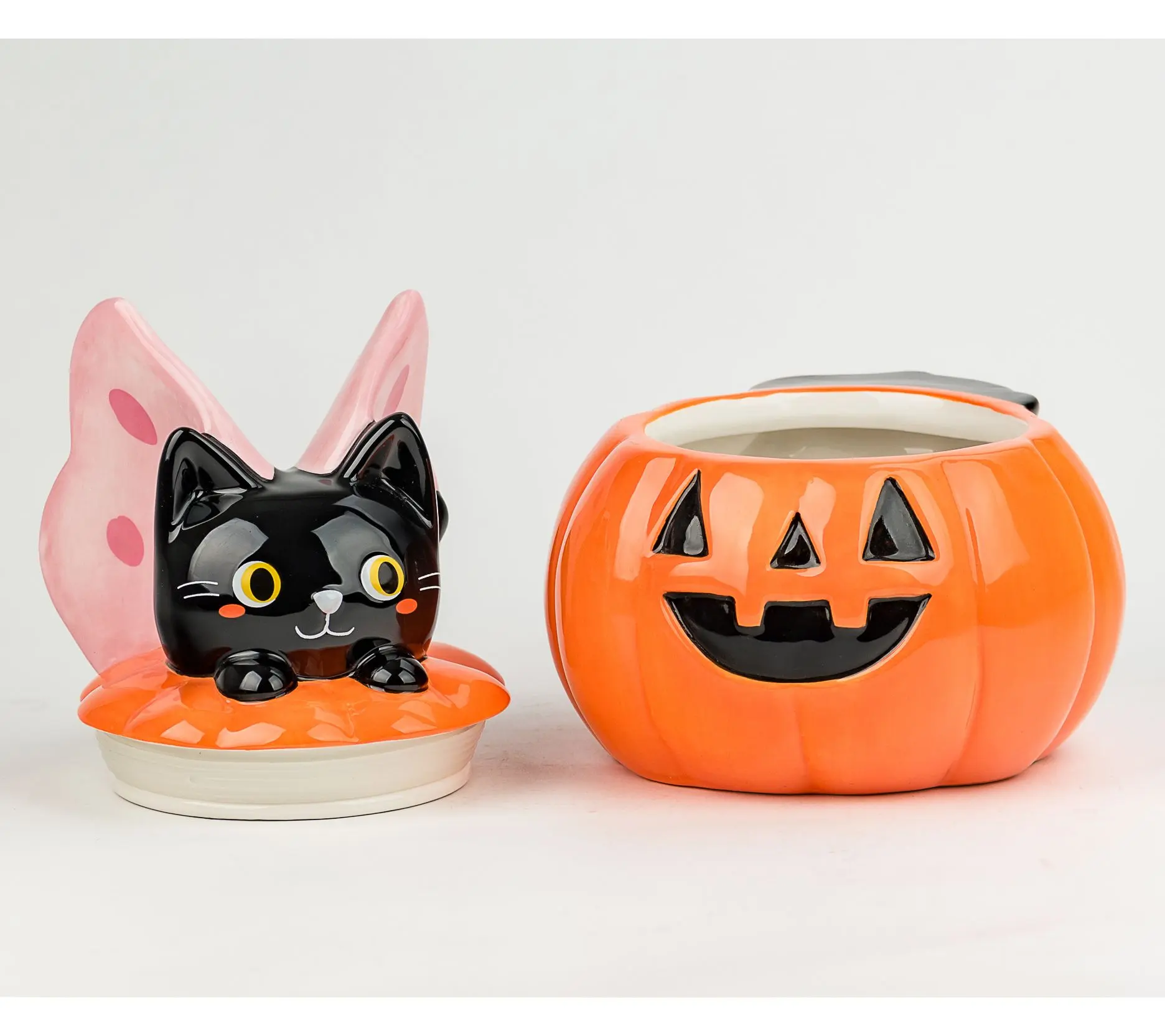This jack-o’-lantern cat cookie jar is the sweetest mix of spooky and cute. #JackOLantern #HalloweenCookieJar #CatDecor #ButterflyCat #FallKitchenDecor