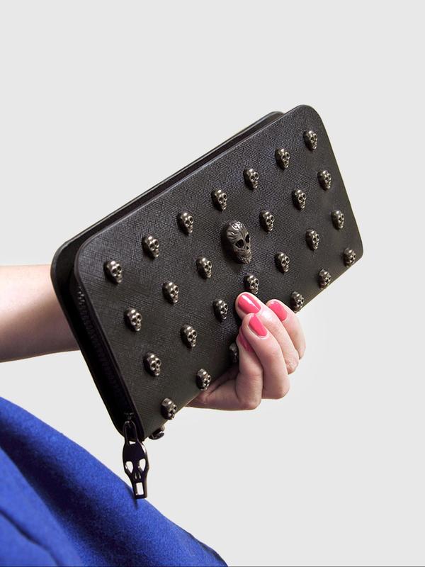 Halloween Black Skull Rivet Coin Wallet, Men's and Women's Wallets, Punk Style Skull Design, Large Capacity Zipper Closure, Wrist Zipper Long Gothic Style Wallet, Durable Travel Accessories