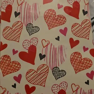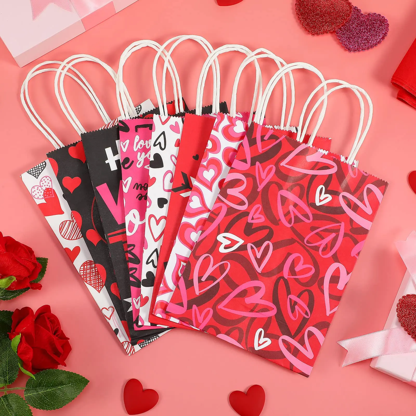 You will receive 32 pieces of Valentines gift bags with 32 pieces of different colors tissue papers, the gift bags design in 8 different styles and 4 pieces for each style.