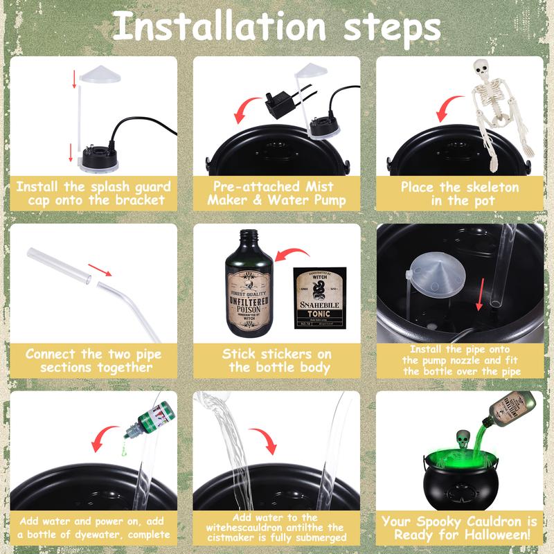 Add an appropriate amount of water to the Christmas magic cauldron and place the LED mist maker inside. Fog will be generated immediately after power is turned on. The included splash guard prevents water splashing out. Please replenish water in time and do not dry burn.