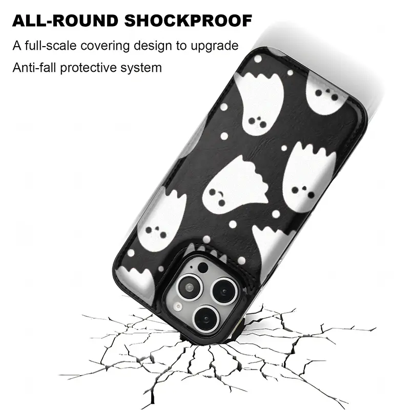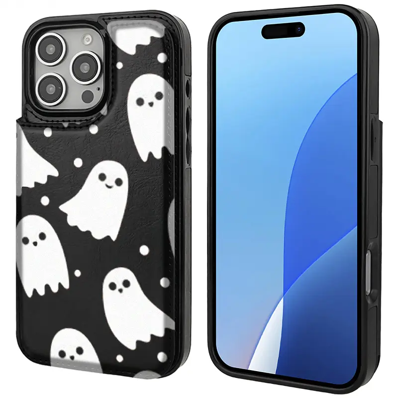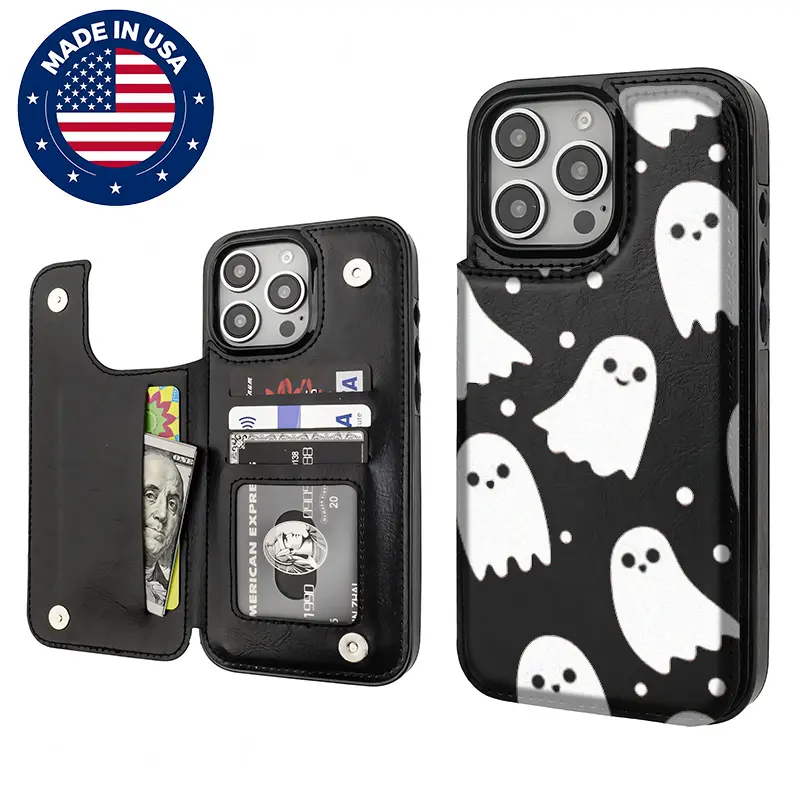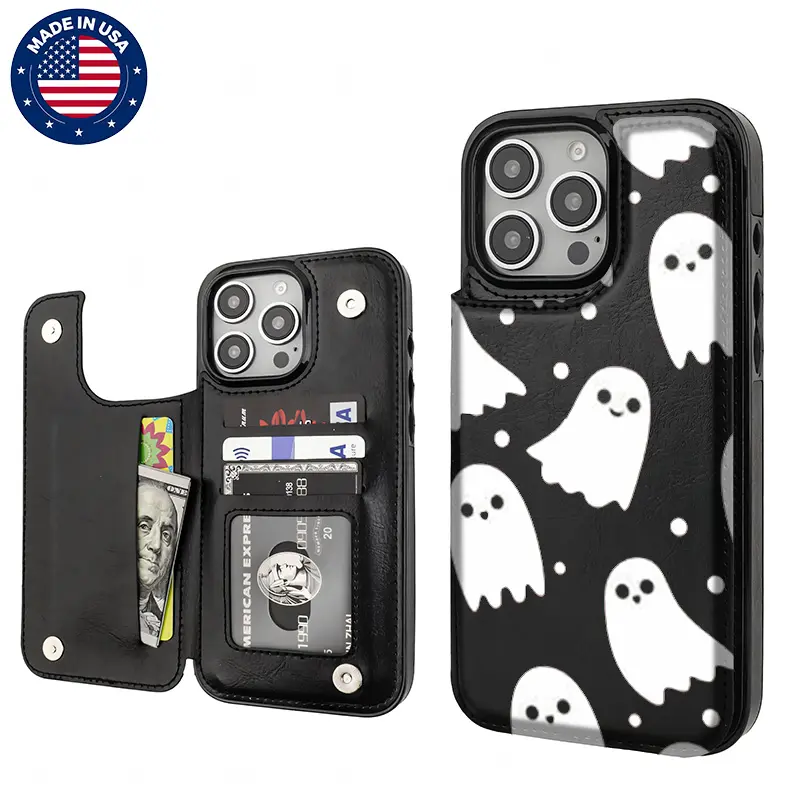 Looking to add a spooky yet stylish touch to your iPhone this Halloween? This cute ghost aesthetic case is just the vibe you need! Designed to fit iPhone models from 12 through 16, including all Pro, Plus, and Max versions, it combines TPU and PU leather for a sleek, durable look. Beyond the eye-catching ghost pattern, it offers practical features like four card slots to stash your ID, credit cards, or some cash—perfect for quick trips without a purse. The case also includes a creative stand, making binge-watching your favorite shows hands-free and comfy. Precision cutouts ensure you never miss a beat with easy access to speakers, charging, and buttons. Plus, the all-round shockproof design keeps your phone safe from drops and bumps. Made in the USA, this case is a perfect gift for tech lovers who want both fashion and function. Ready to protect your phone with flair? Grab this unique Halloween ghost case and flaunt your spooky style all year long!