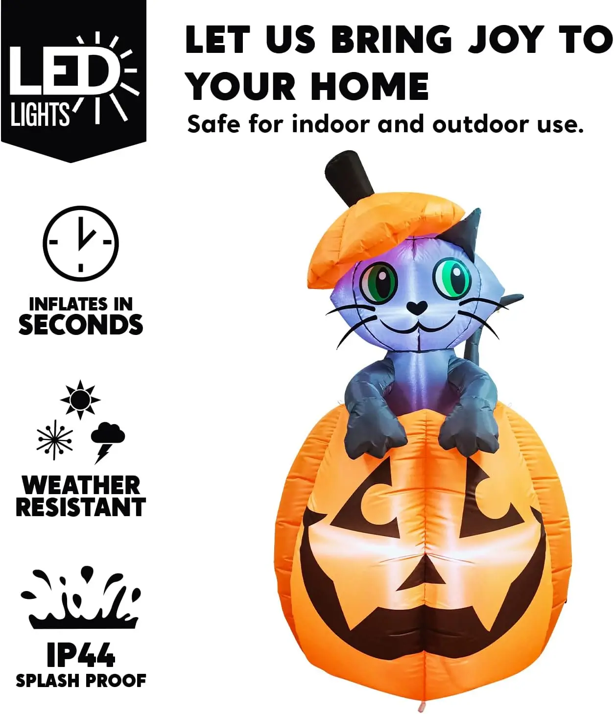 ·Premium Quality UL Certified. This Halloween Inflatable animated cat on pumpkin is safe and easy to set up, plug in, then everything pop-up right away. This Halloween yard decoration is made of high-quality waterproof fabric. Not easily torn. The excellent suture keeps it inflated all the time. So even if it is inflated for a long time, there will be no air leakage.