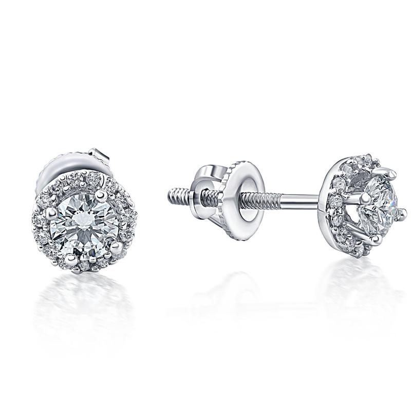 This matching pair of women's earrings features larger round brilliant cut natural diamonds and 24 accent halo natural diamonds. All diamonds are set in solid 10k white gold. The earrings are secured with 10k white gold screw backs.