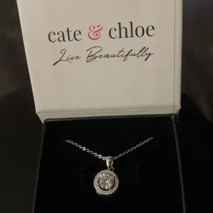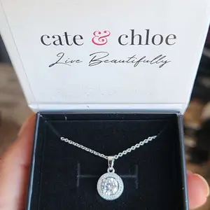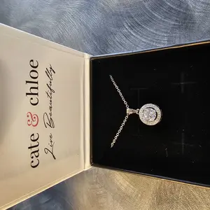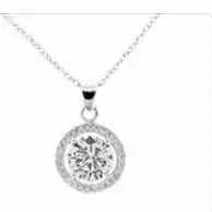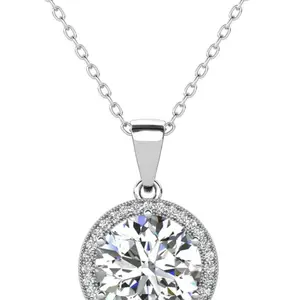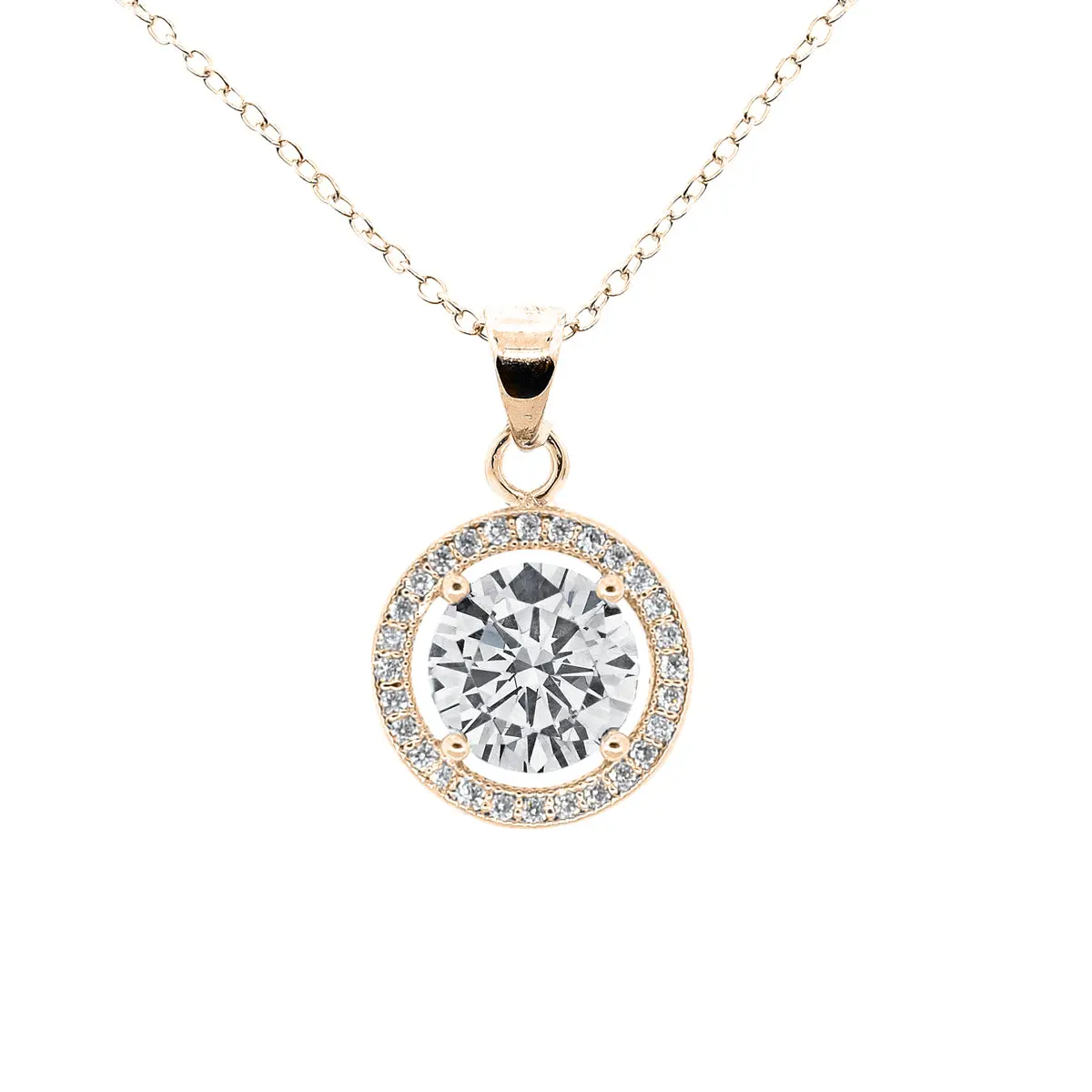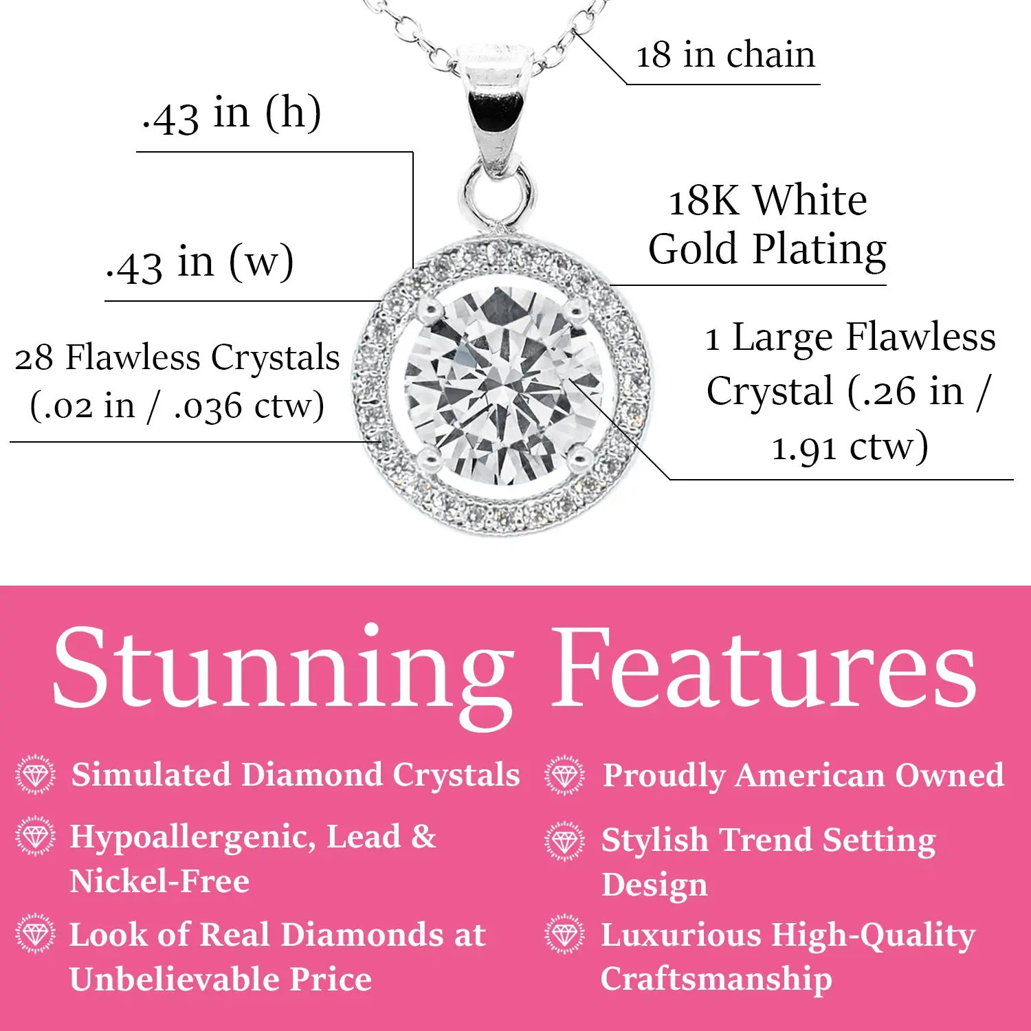Blake 18k White Gold Plated Halo Pendant Necklace Simulated Diamond Crystals - Elegant and expressive, this exceptional pendant necklace for women showcases a captivating 6.6mm round-cut AAA+ grade Simulated Diamond Crystal encircled by an array of 28 crystals measuring .5mm each that form an endless loop of elegance.