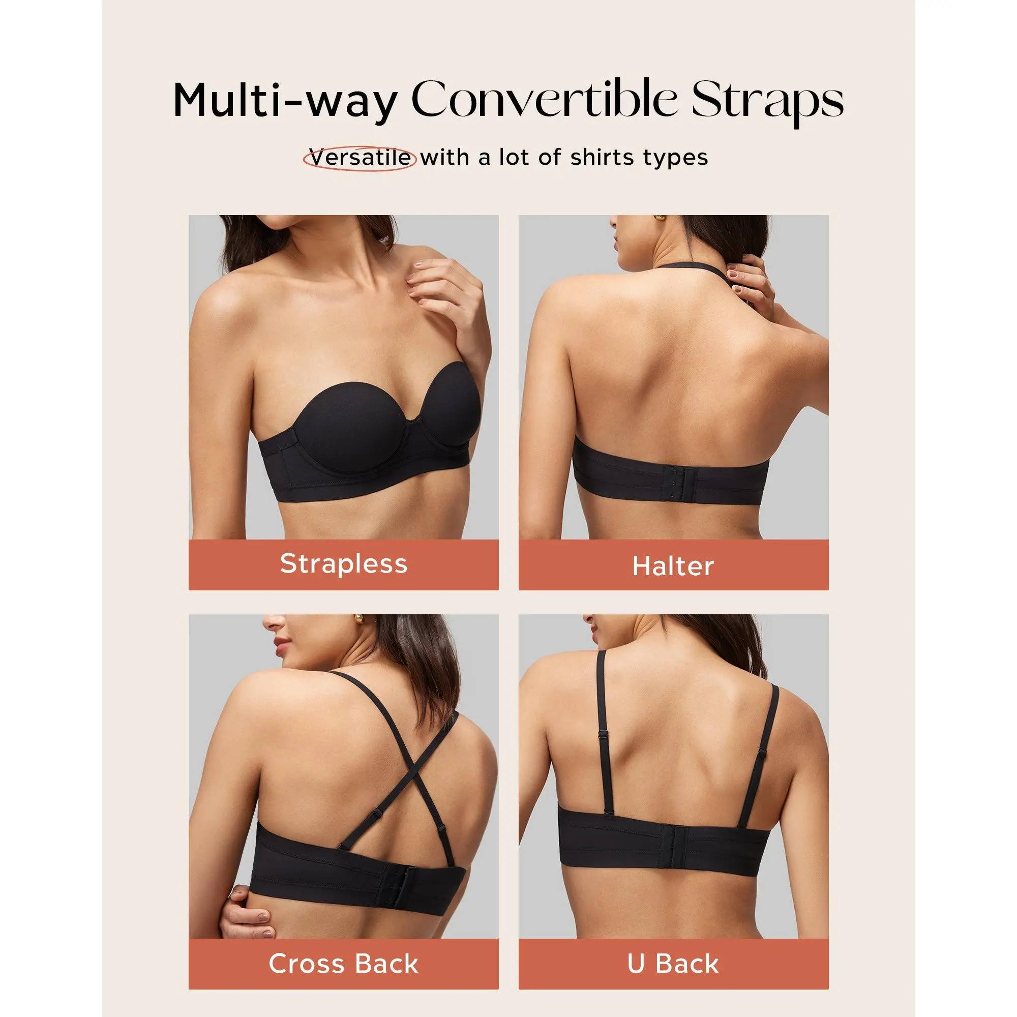 ·Silicone no-slip strip with convertible straps, fit for any and every occasion.