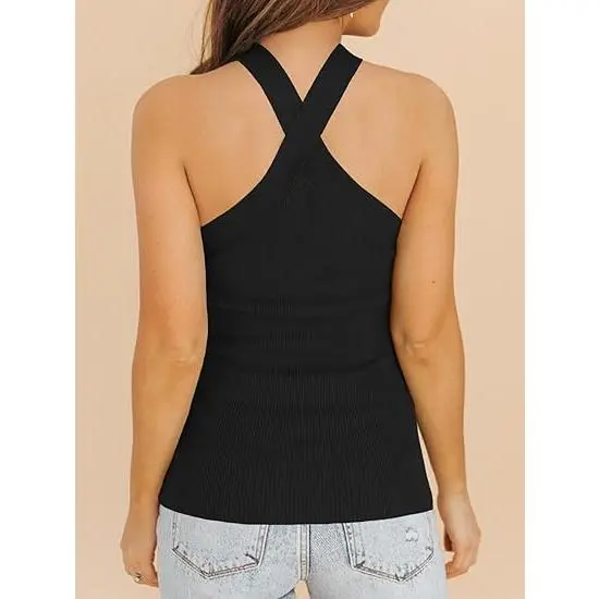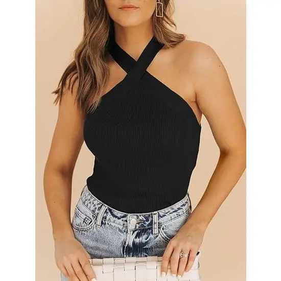 5. Imily Bela Womens Criss Cross Halter Sweater Vest Tops Summer Sleeveless Pullover Casual Lightweight V Neck Knit Tank Top Black Minimalist tank tops