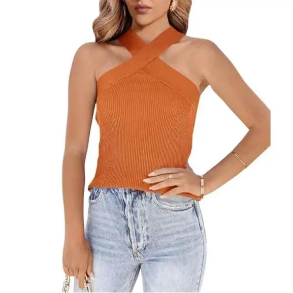 ·80% Viscose,20% Nylon.Halter Neck, Sleeveless, Criss Cross Strap, Summer Top,Sweater Vest.