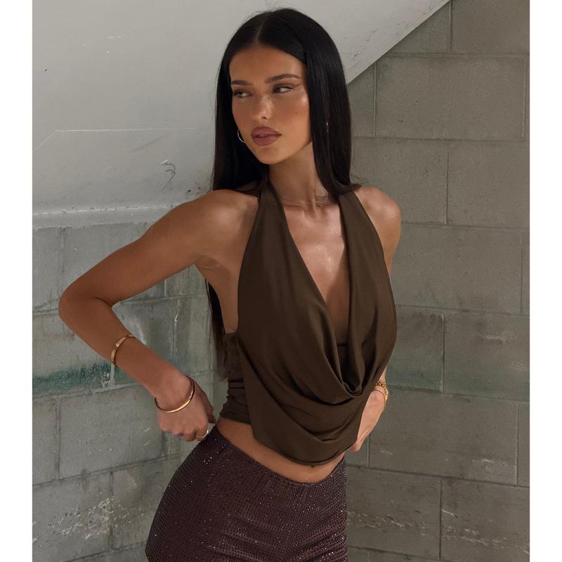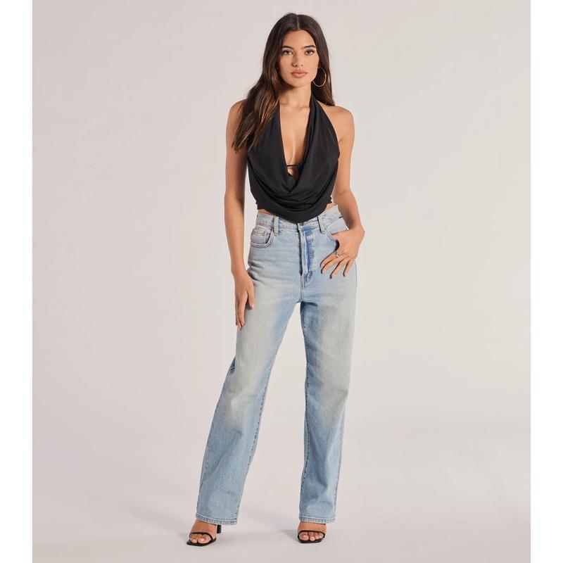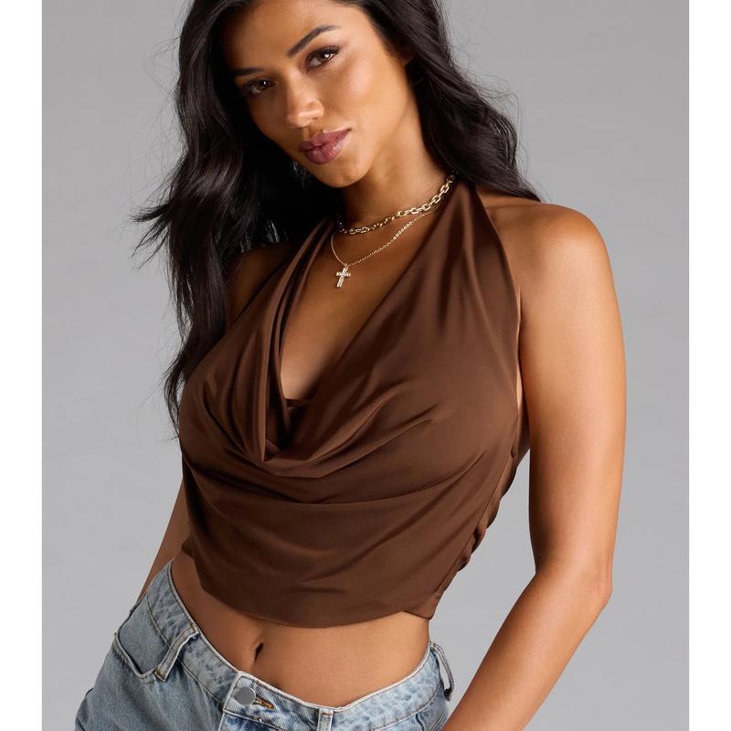 Take the plunge and dare to show skin in this sleeveless halter crop top for a night out! Featuring a halter cowl neckline with bar trim, an open back, and a stylish crop hem, this top is perfect for standing out and making a statement. Complete the look in sleek faux leather pants.