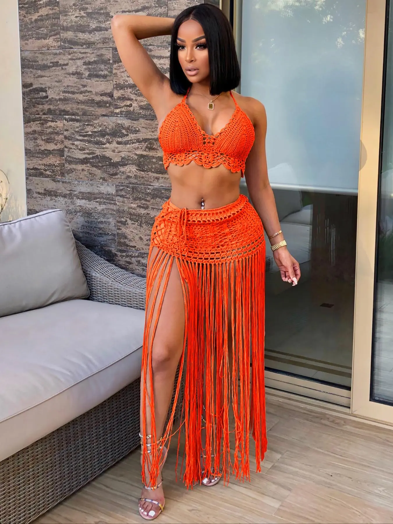 Two-Piece Set Halter Crop Top & Fringe Skirt 🌴✨ Look playero y chic con este conjunto de top halter y falda con flecos, ideal para el verano. #BeachOutfit #SummerStyle #FringeSkirt #HalterTop #ChicSet #tiktokshopbacktoschool