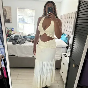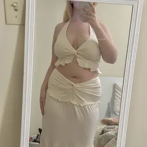 OH MY GOD! This set is gorgeous. As a chubby girl with deep hip dips (145 lbs 5'3) i dont like wearing anything tight fitting around my hips but the skirt is flowy enough to not accentuate it which i love. the halter top is really supportive, and im 34DDD. Definitely get this!