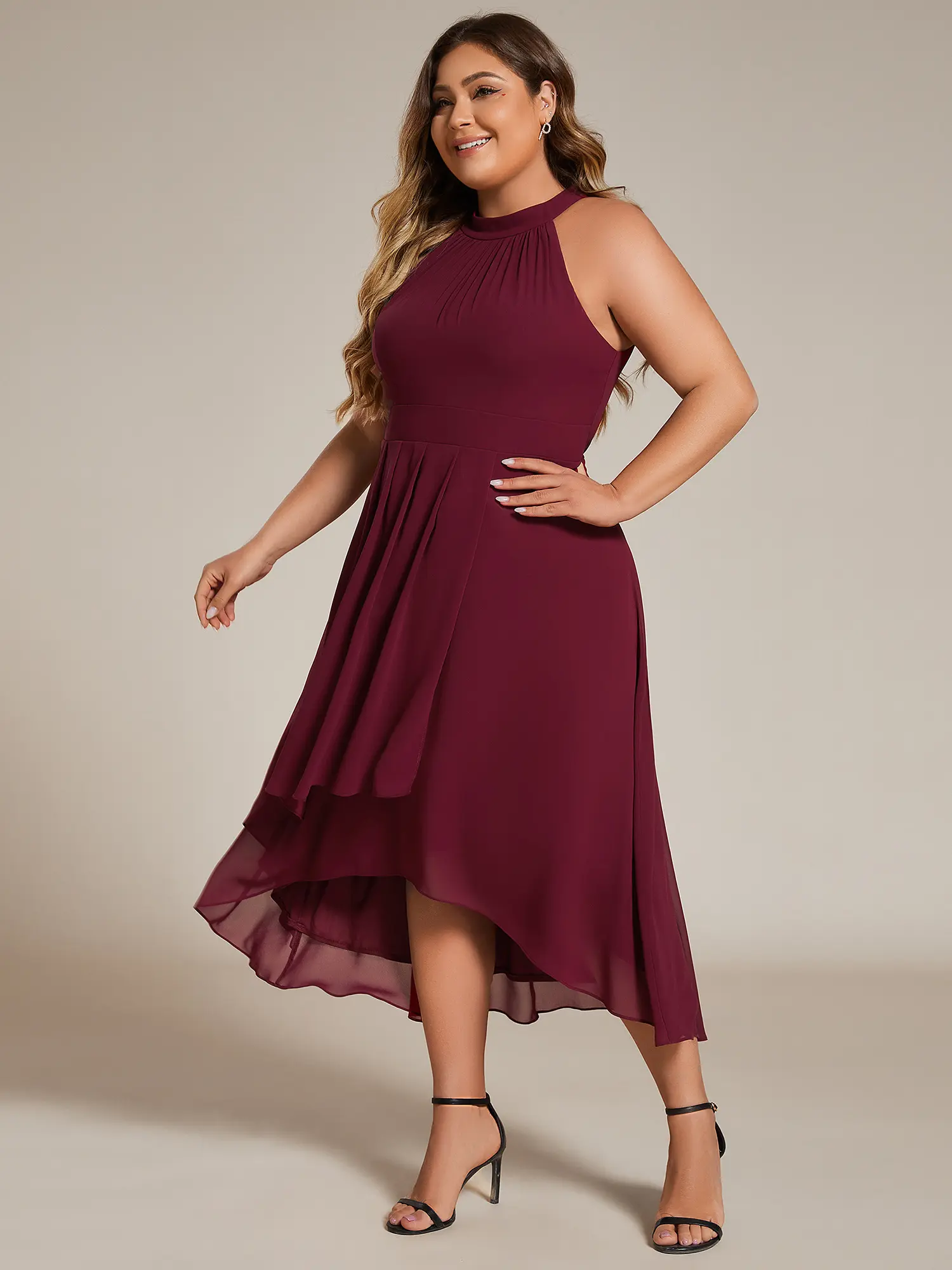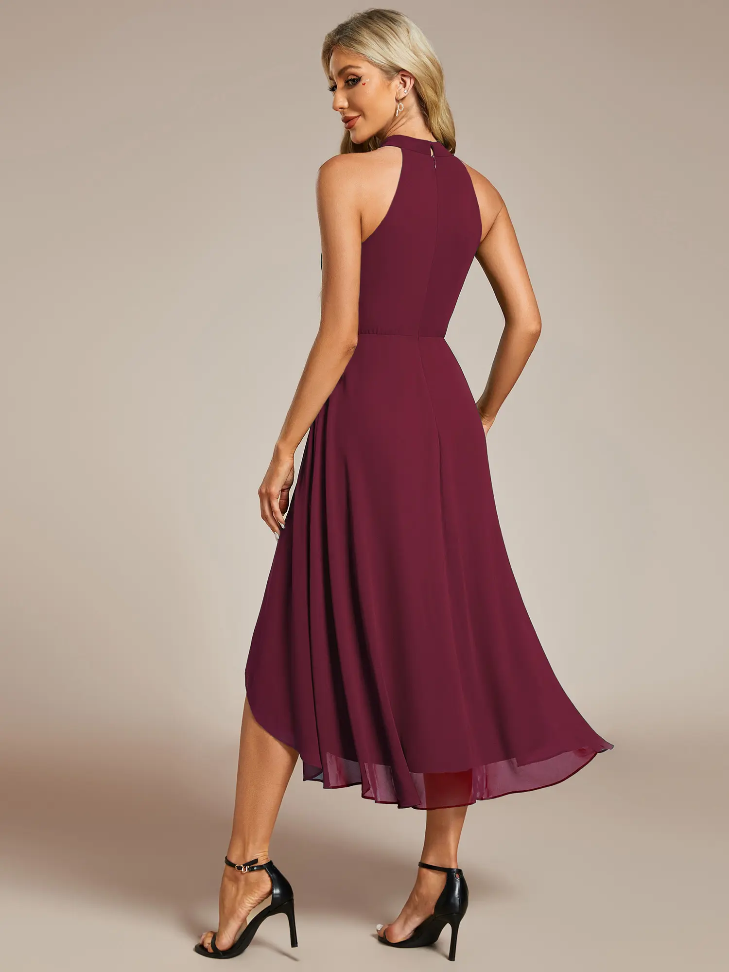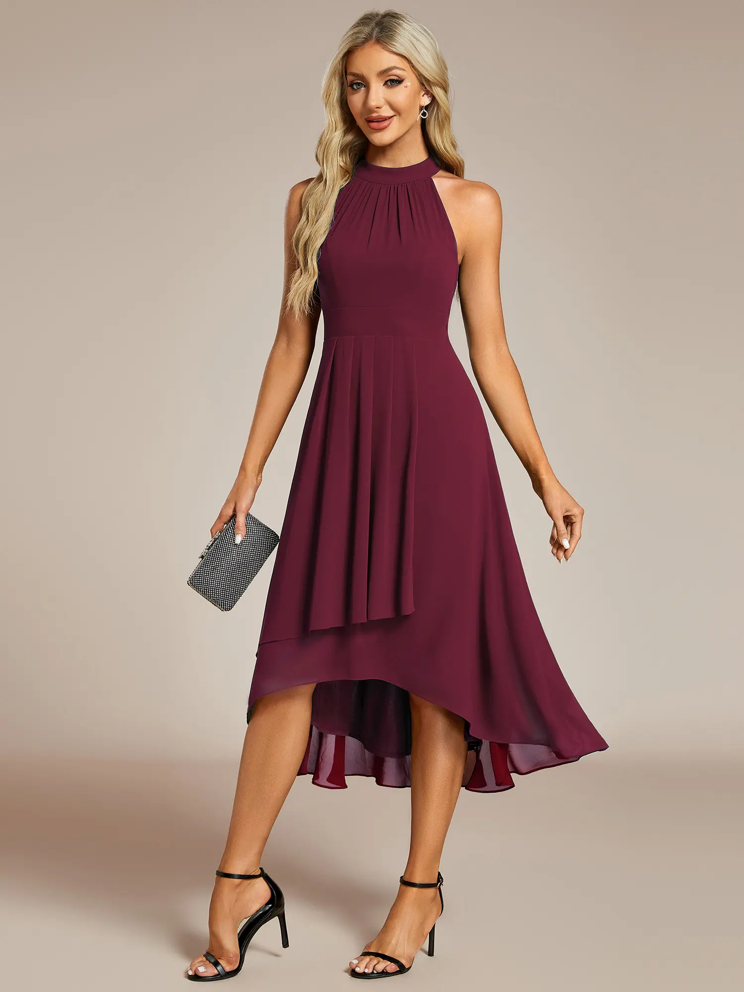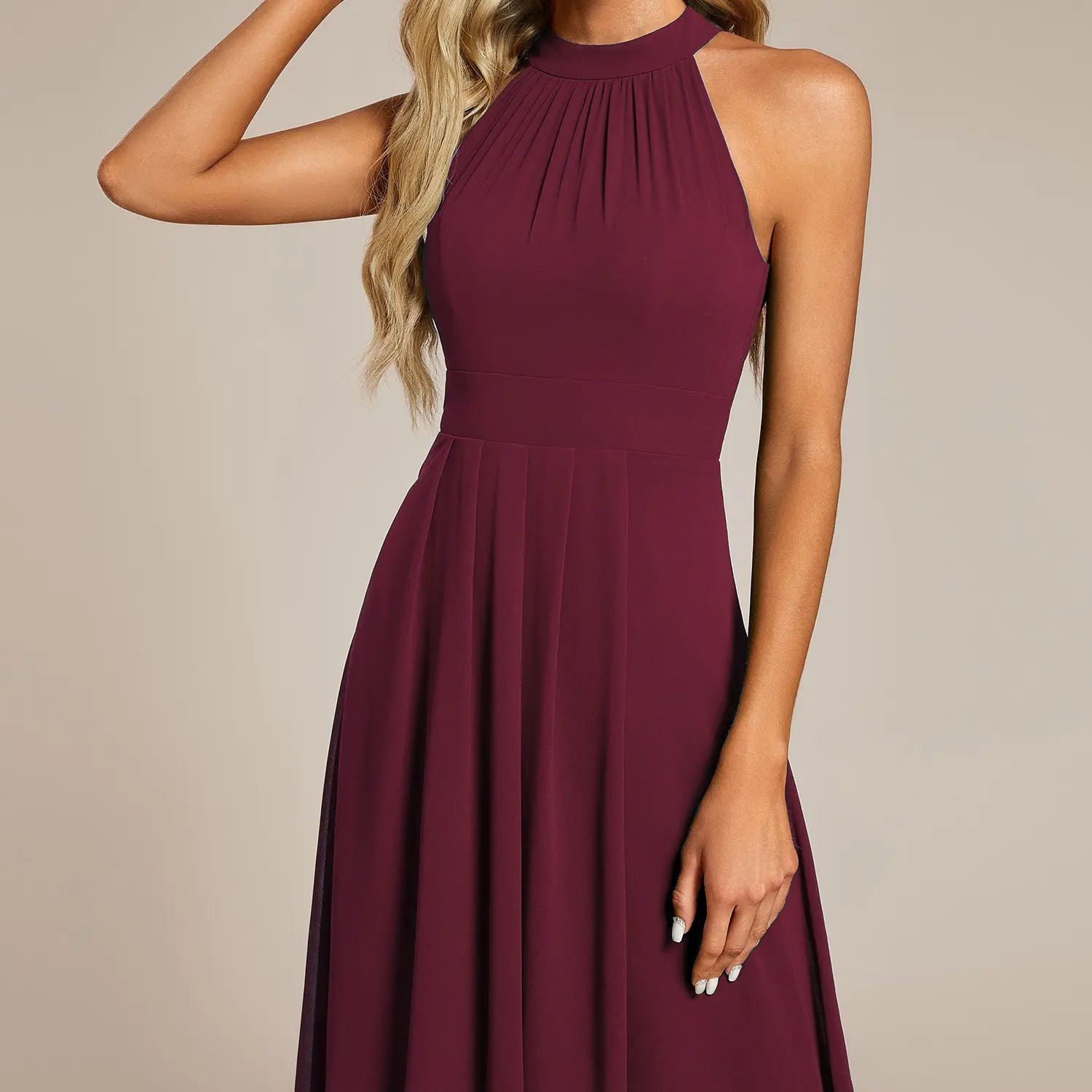 This sleeveless halterneck chiffon wedding guest dress exudes effortless glamor and elegance with an A-line silhouette and intricate pleat detailing.