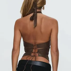 5. Women's Solid Lace Up Backless Halter Top, Fashion Casual PU Leather Top for Daily Outdoor Wear, Ladies Clothes for Summer