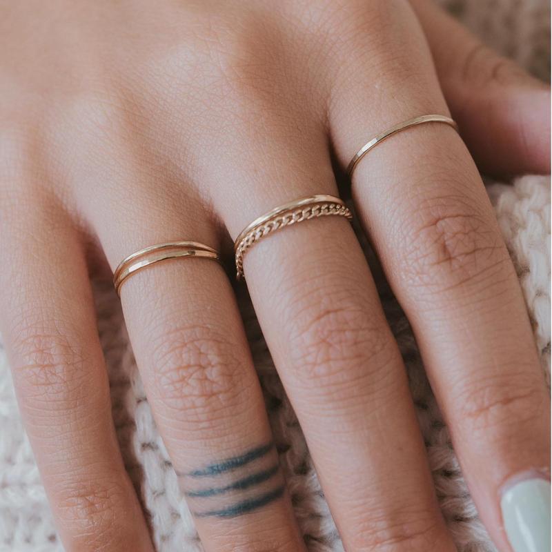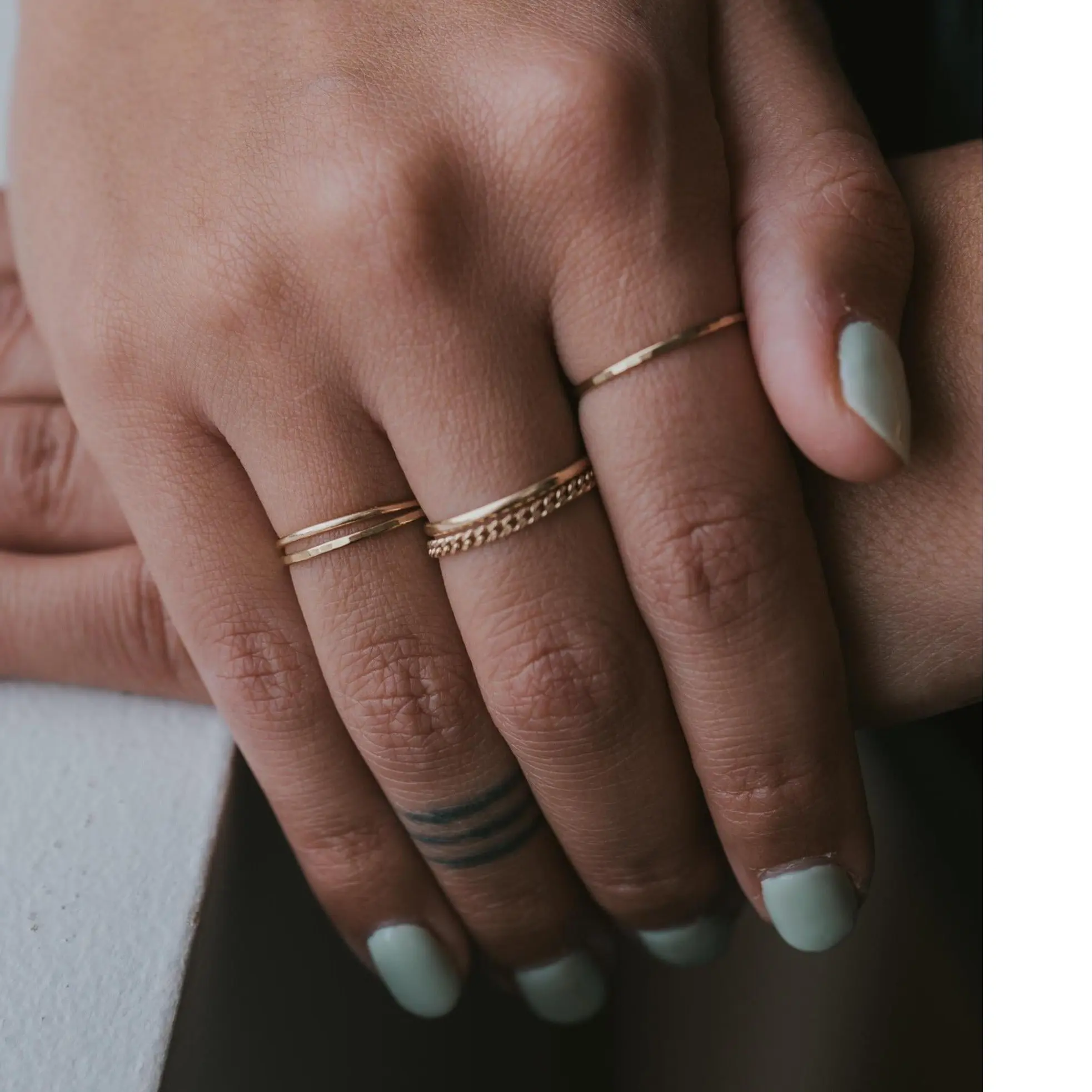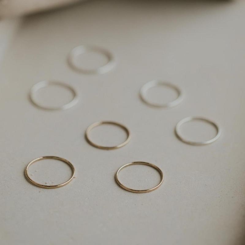 I stacked a silver tiny hammered band with two gold teeny tiny bands to wear on my thumb and I love the look. Great quality!