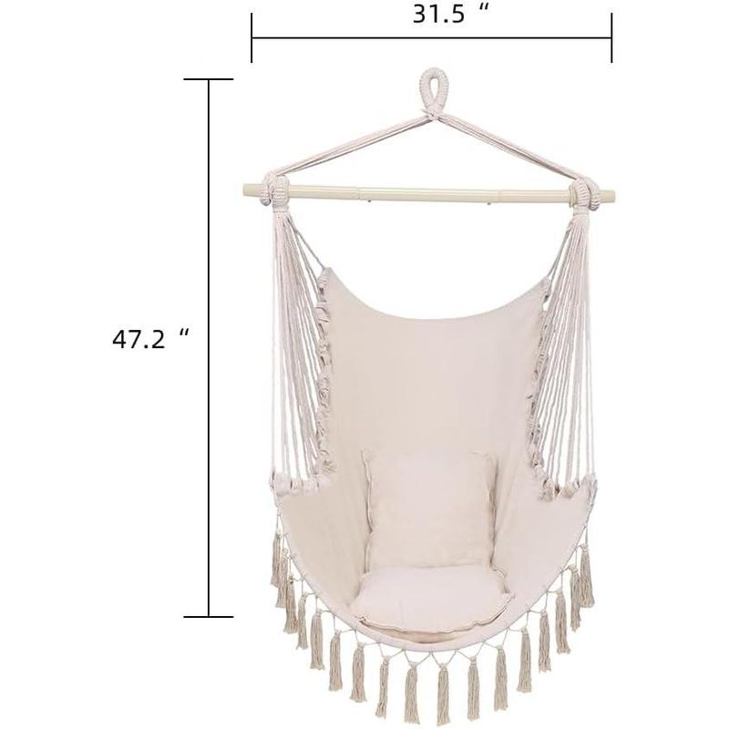 ·The hammock swing chair features a robust 31.5" steel spreader bar and two grooves at each end. This design ensures secure use and prevents slipping. It can hold up to 550 LBS, suitable for various body types.