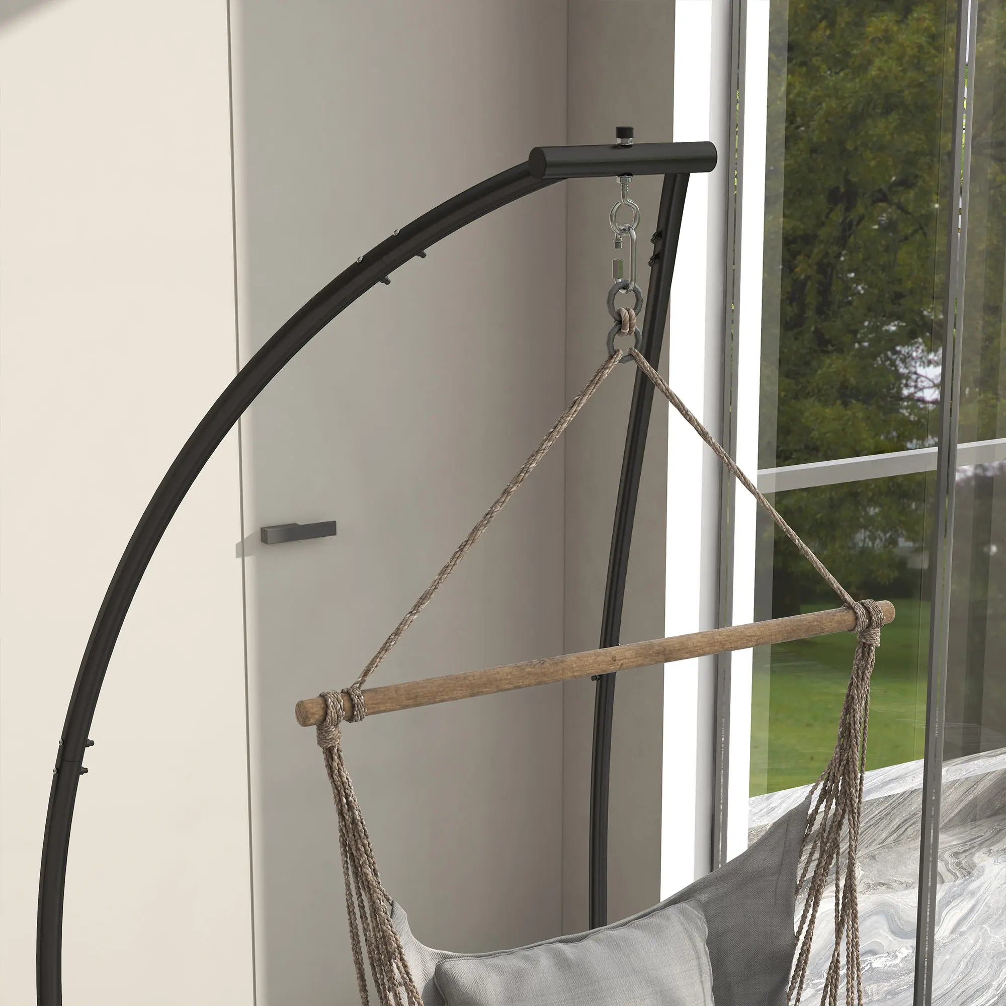Have a swing chair but no place to hang it? With this swing chair stand from Outsunny, you don't need to drill a hole into the ceiling to sit in cozy boho comfort. Weather-safe powder-coated steel and compact size make our hammock chair stand equally useful in outdoor spaces like the patio, porch, or garden and indoor spaces like living rooms or bedrooms. A single person can assemble this hanging hammock chair stand, and it comes with step-by-step instructions. Get out, get comfy, get Outsunny.