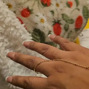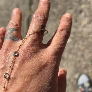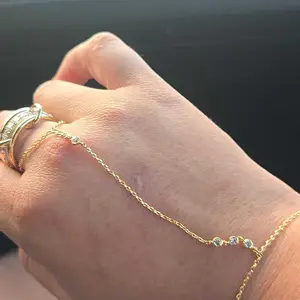 Ā·Beads: This hand chain is designed to inspire double takes all dayāa subtle, sophisticated, and dainty piece combining a bracelet and ring with an added gold bead accent. The ring portion is 4.2 inches, middle chain is 3 inches, and bead is 3mm.