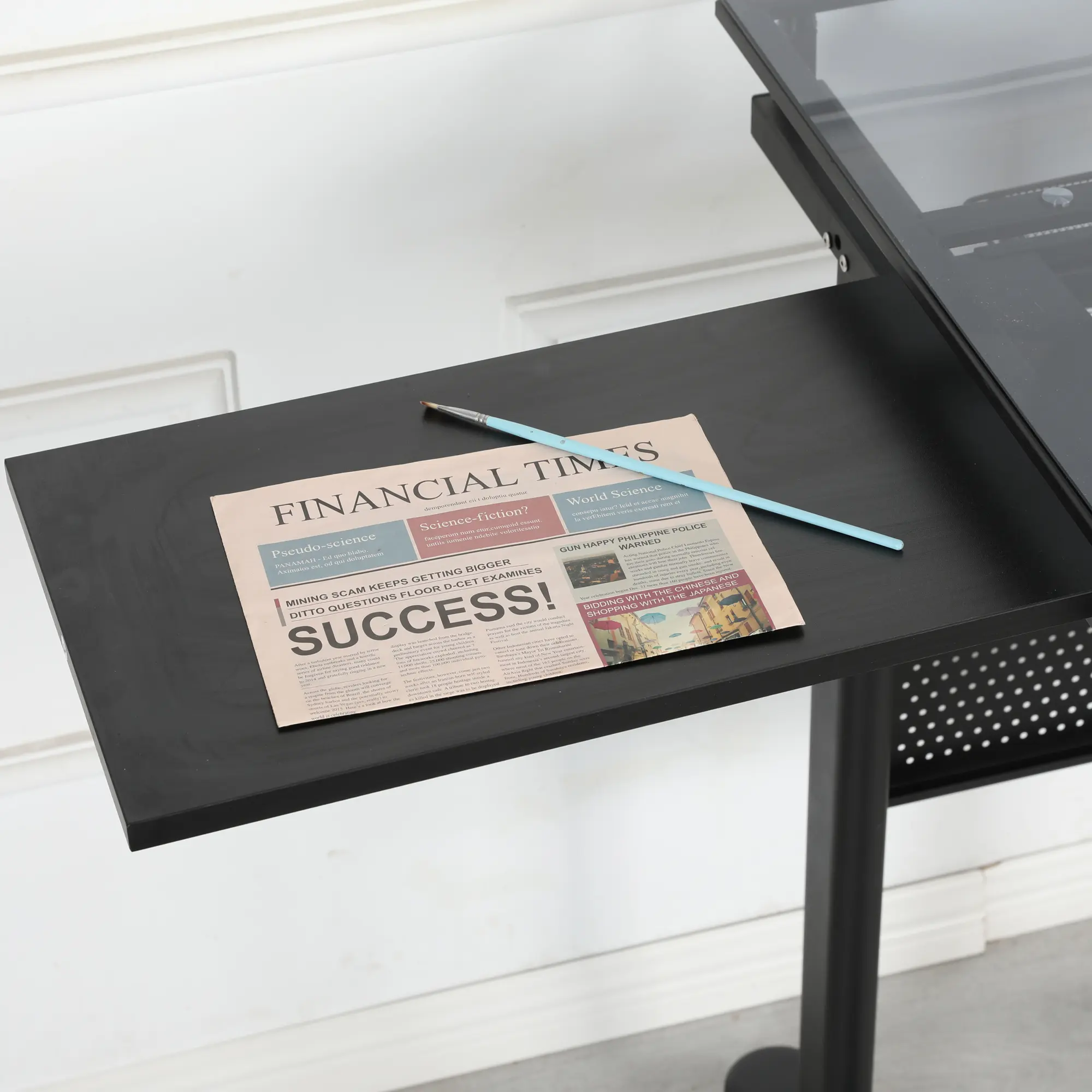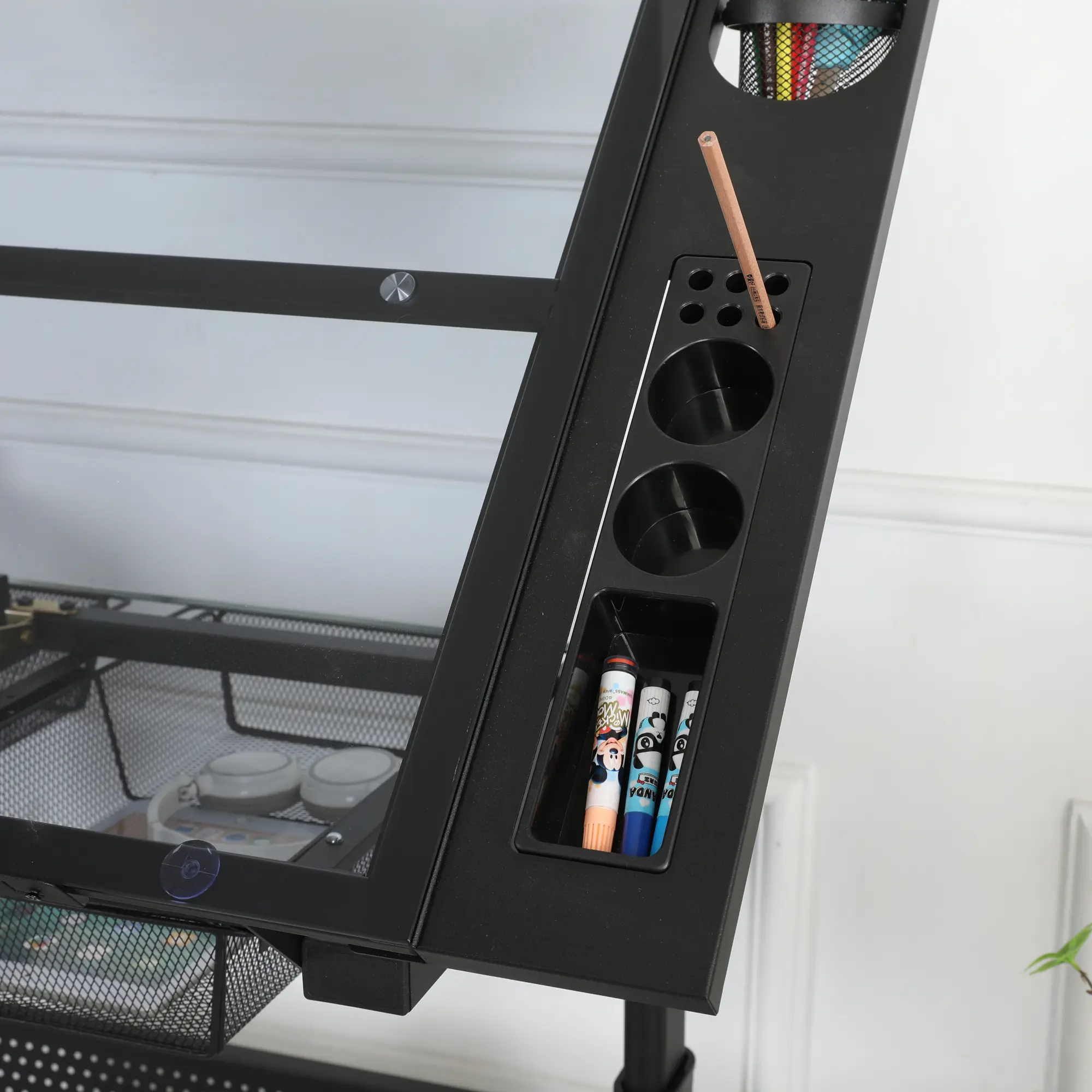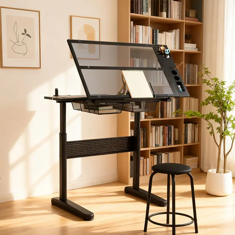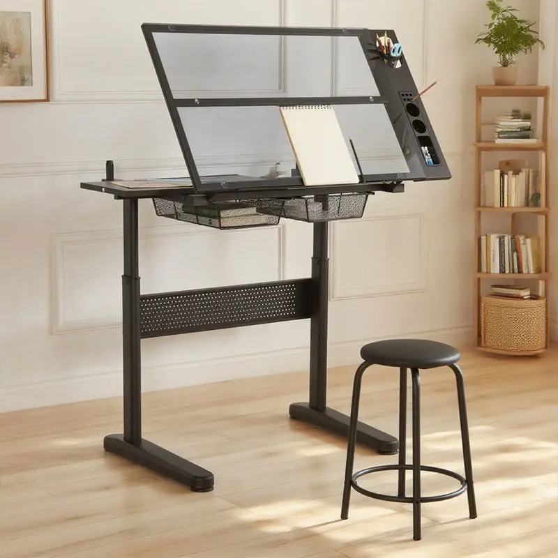 hand crank adjustable drafting table drawing desk with 2 metal drawers (BLACK)WITH STOOL