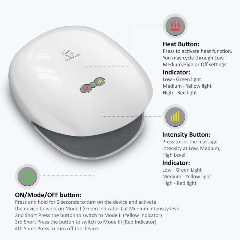 ·Soothing Heat Therapy, Comfier hand warmer wassager with heat compression helps keep your hands warm and moist prevent dryness. It provides gentle heat and helps promote blood circulation and ease soreness muscles, numbness and cold fingers and palm. You can personalize your massage by setting 3 pressure programs with 3 heat levels.