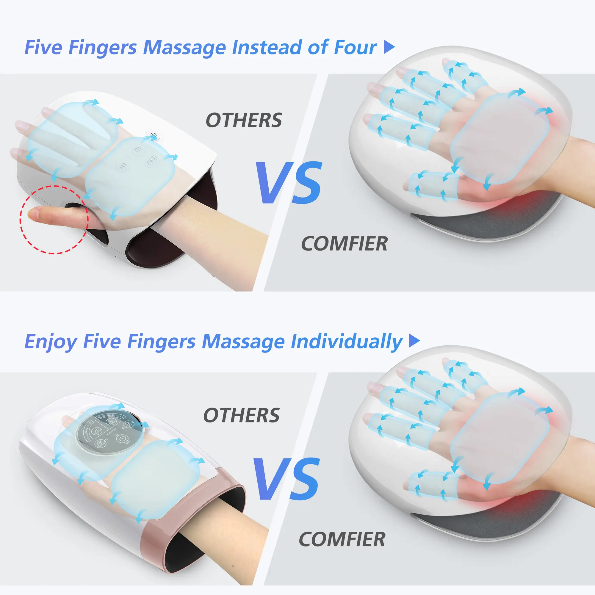 ·Ultimate Hand Relaxation, Comfier electric hand massagers are specially designed to adopt compression to massage every part of your hand and work on the fingers and knuckles to ensure total relaxation. The hand massager helps soothe knots and effectively relieve carpal tunnel and ease finger stress.