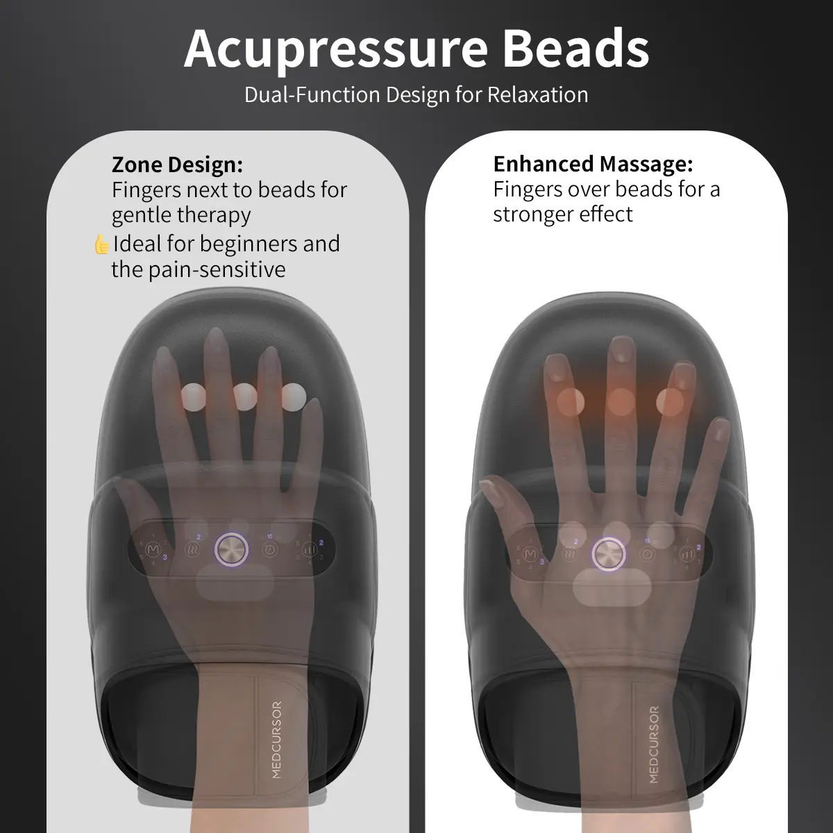 Experience deep, comprehensive hand massage with airbag pressure. It targets every acupoint from palm to fingertips, providing a thorough and effective massage experience. Featuring 7 acupressure beads, offer 2 unique massage experiences. Place fingers beside or directly on the beads. For low pain tolerance, begin with the side placement first.