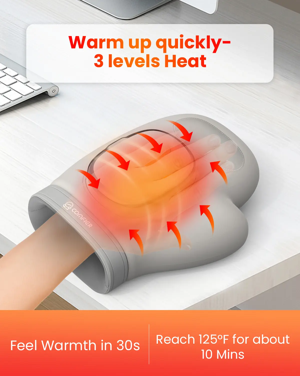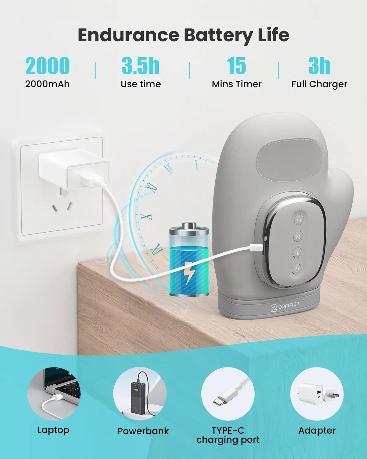 ·Rechargeable & Portable,Comfier hand massagers devices is designed for easy portability,with a built-in rechargeable battery that can be charged using a USB cord. Once fully charged, it can work continuously for up to 90 minutes. To ensure safe use, the massaging function comes with an automatic timer that shuts off after 15 minutes.Weighing only 1.65 lbs that making it the perfect choice for use at home, in the office or while traveling.