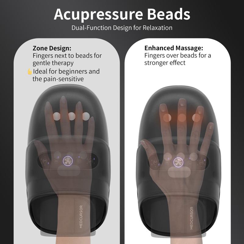 ·[Airbag & Acupressure Massage] Experience a deep, comprehensive hand massage from palm to fingertips with this hand massager. Utilizing airbag pressure and bi-directional acupoint massage, it massages every acupoint in the hand with upper and lower airbags. It features 7 acupressure beads, offering 2 unique massage experiences depending on whether fingers are placed beside or directly on the beads. For those with low pain tolerance, it's better to try placing fingers beside the beads first