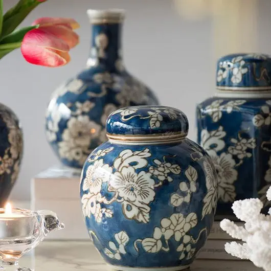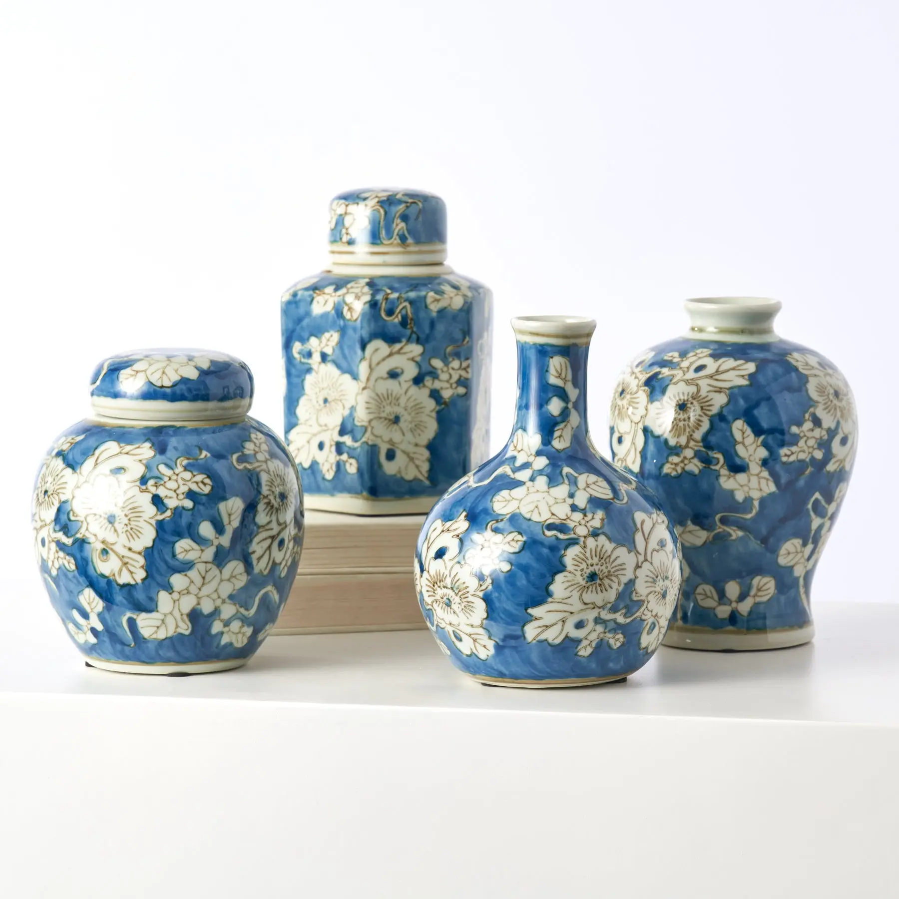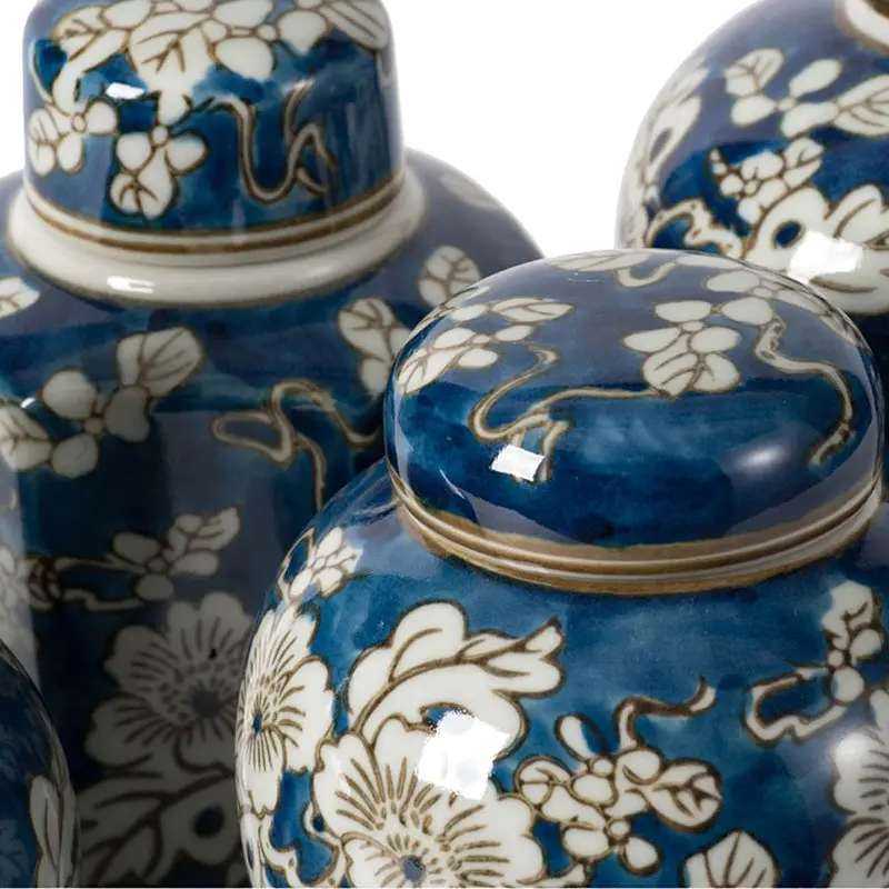 This set of four ceramic pieces provides an elegant, coordinated look with its lavish blue background, crisp white flowers and touches of gold. Whether used as flower vases or as storage containers, these graceful jars and vases bring cohesion to any room. Highly versatile, this set is suitable for any room and helps to create personalized floral arrangements that reflect your personal style. This piece will boost the liveliness of your room and add a fun detail to your home decor. Place them on mantels, end tables, bookshelves, or in a home office for a truly striking look. Crafted from porcelain and glazed for a smooth finish, each jar showcases a unique, vibrant shape and pattern.