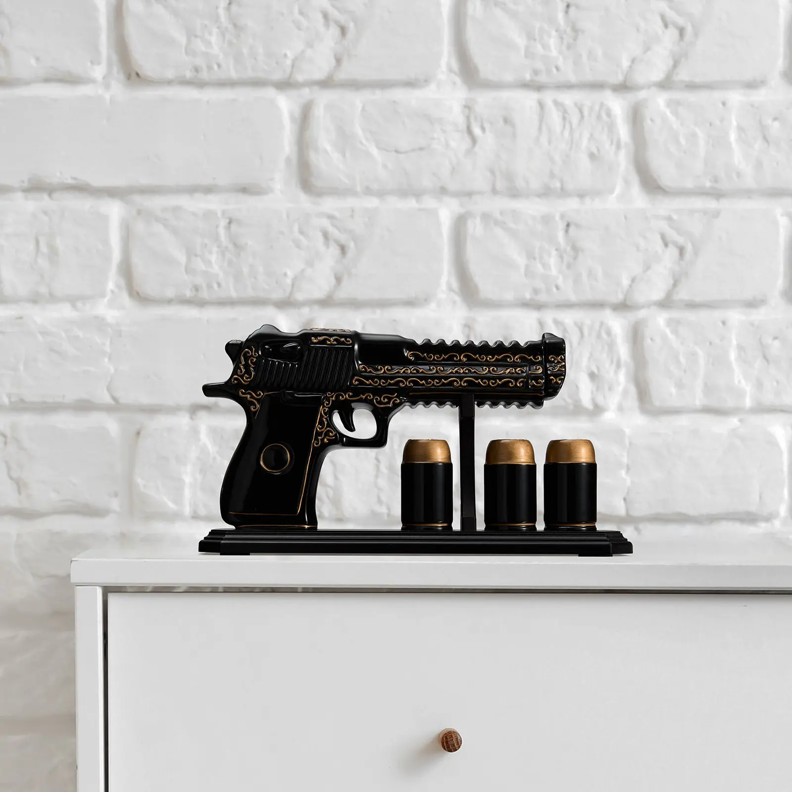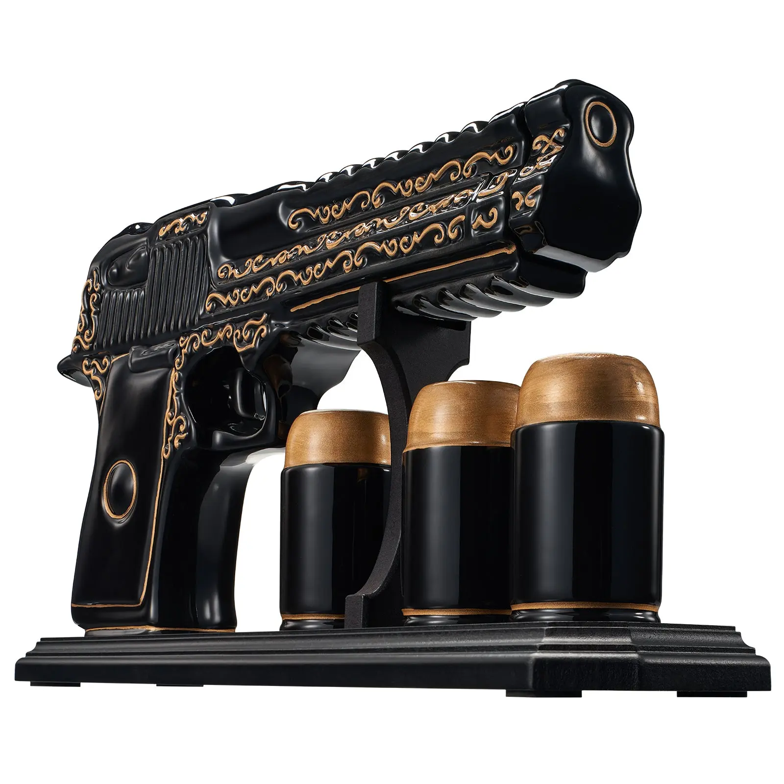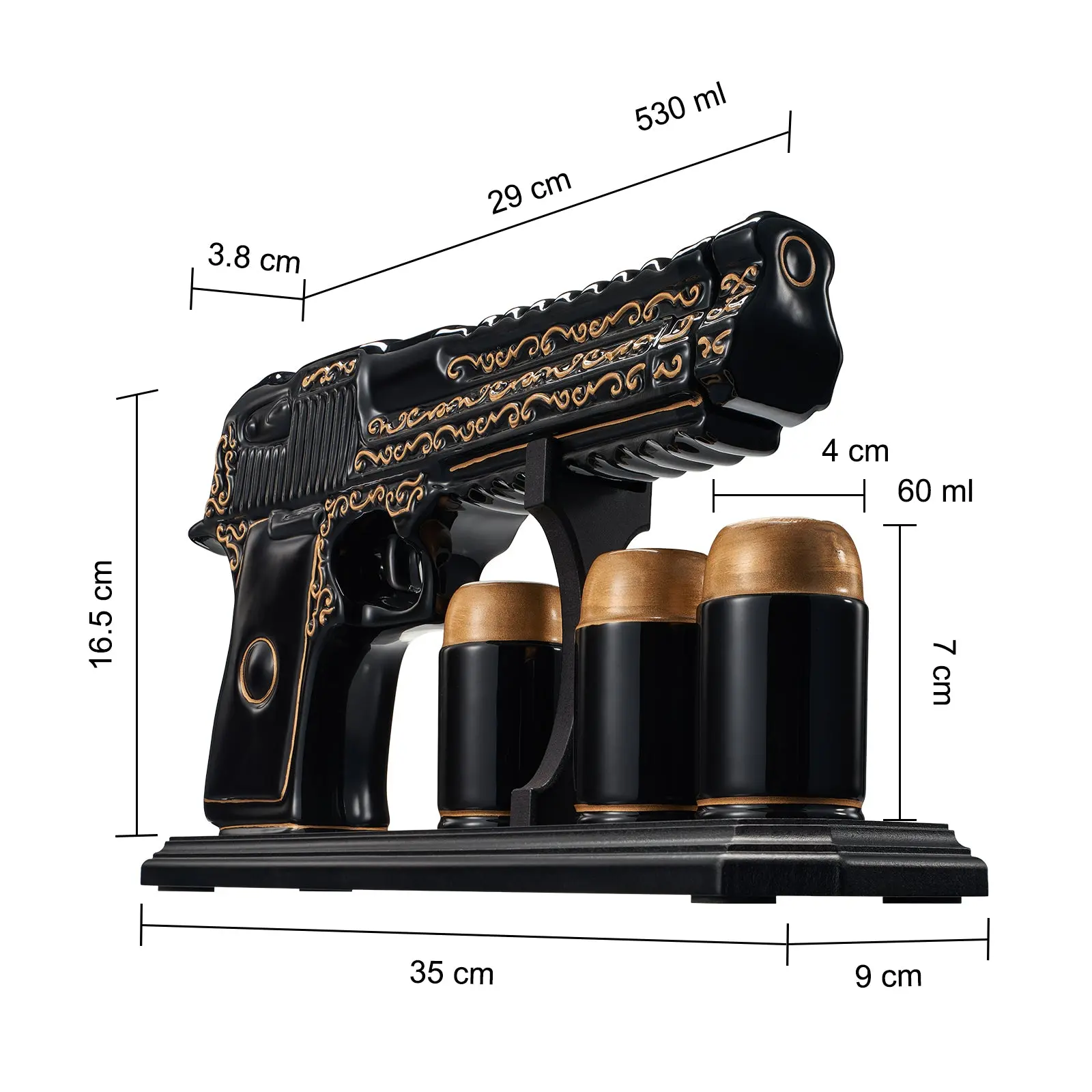·DRINKING WHISKEY WILL NEVER BE THE SAME: Pistol Gun Decanter & 3 shot glasses paired with a black display stand. Can you imagine how classy this will look in your bar? This hand painted whiskey decanter gun will start your drinking with a bang. The black paint with the gold accents are sure to be a wonderful addition to any home bar.
