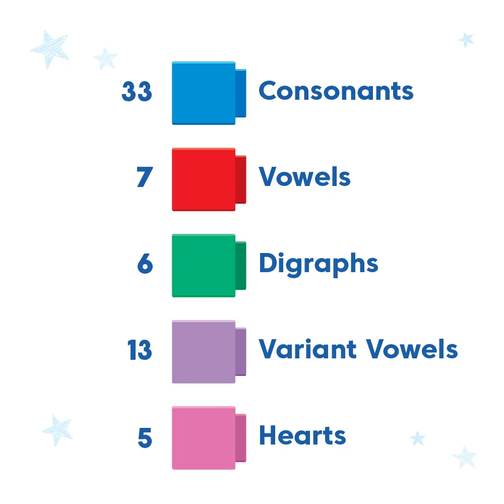 ·64 color-coded rods include consonants, vowels, digraphs, vowel teams, and hearts.