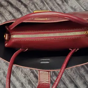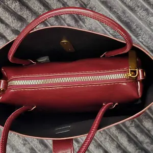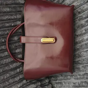 The purse is really nice shiny burgundy, super soft, and dainty. Has lots of room.