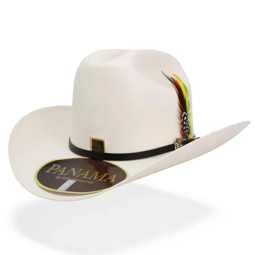 This exquisite piece is made from Shantung (Rice Paper) with a remarkable 1,000X Quality mark. It features a crown size of 4 1/2 inches and a brim size of 3 1/2 inches, providing a perfect balance of style and comfort. The hat is shaped in the unique "Panter Belico con Plumas" design and adorned with genuine feathers, adding a touch of elegance. It is branded by Panama by Red Diamond Boots, ensuring authenticity and prestige.