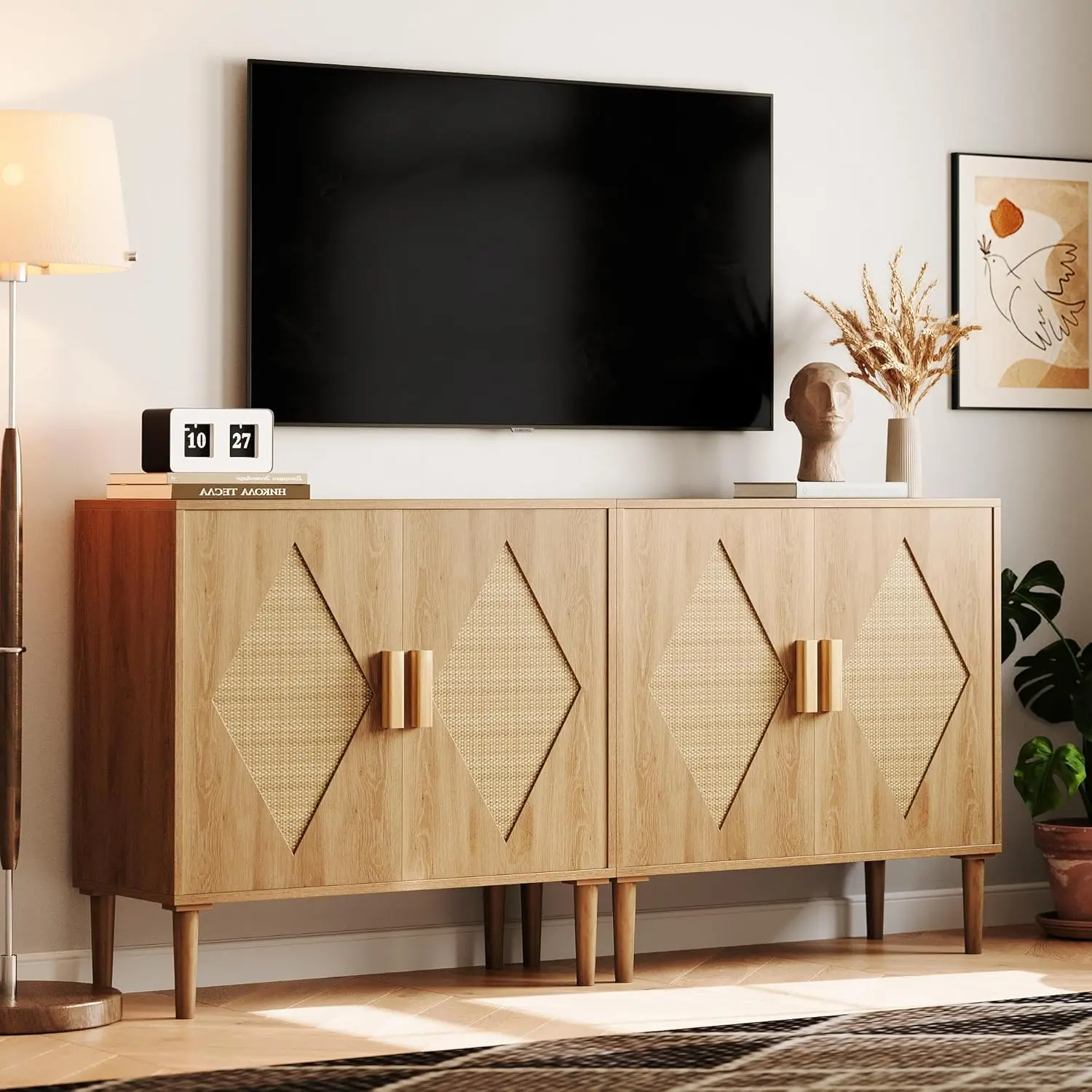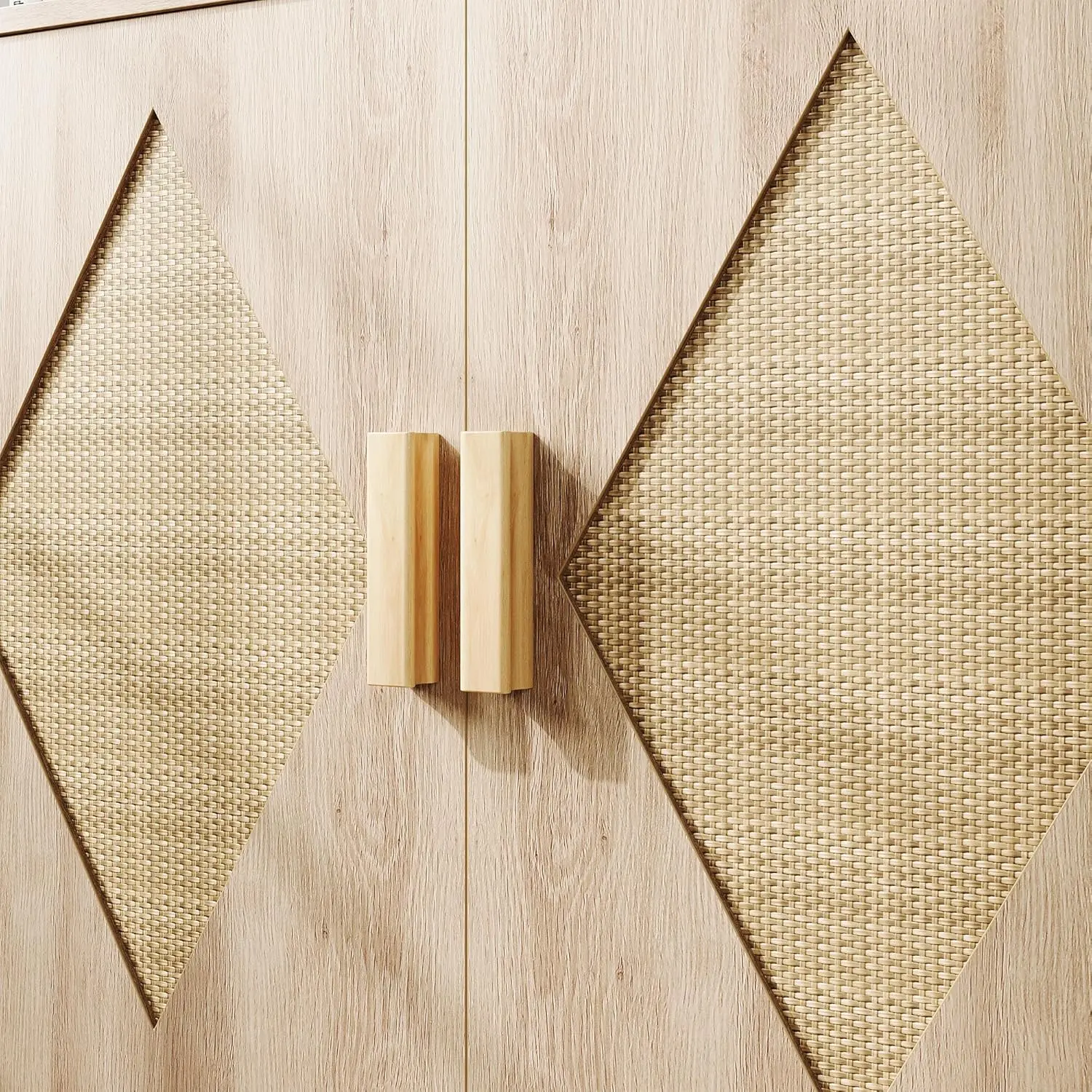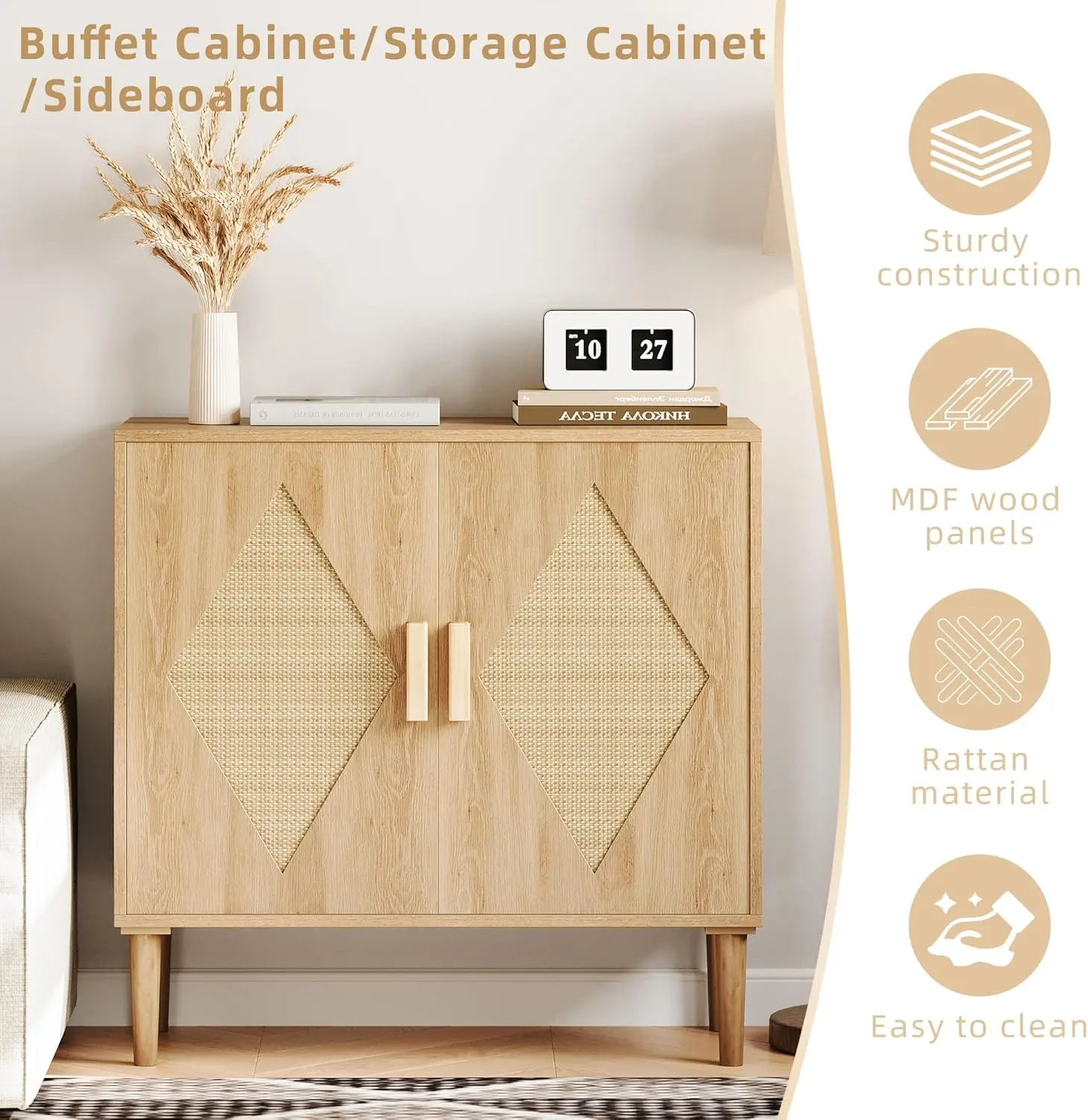 ·Handcrafted Rattan Storage Cabinet: This rattan cabinet features handcrafted rattan decorations on its two doors, combined with a natural wood finish to deliver a bohemian style. It is an ideal addition to home decor, offering both aesthetic appeal and practicality.