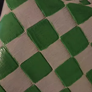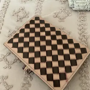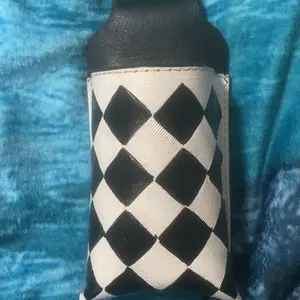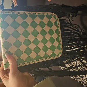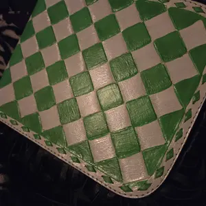 Quality of work: Unbelievable, they spared no expense when making this bag. It a black white checkered print with a paisley print it. Also, the handle is weaved with black and red leather.
