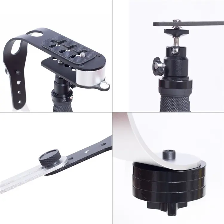 Key Features: Lightweight aluminum build, arc balance design, adjustable counterweights, 5-position handle mounting holes, rubber non-slip support plate, gimbal rotating handle
