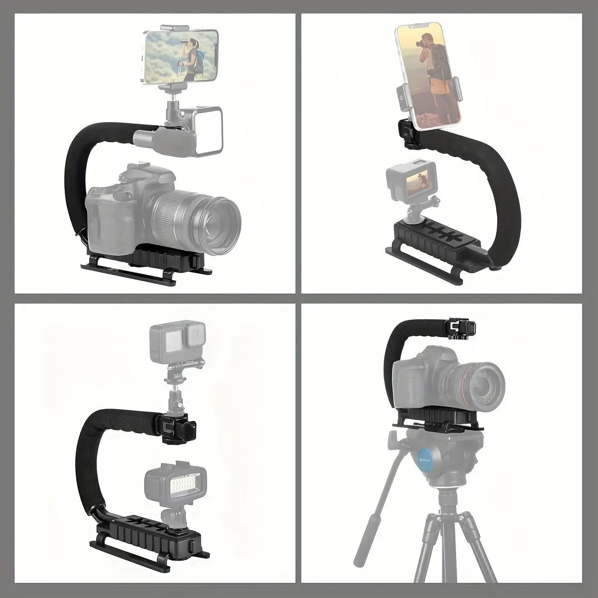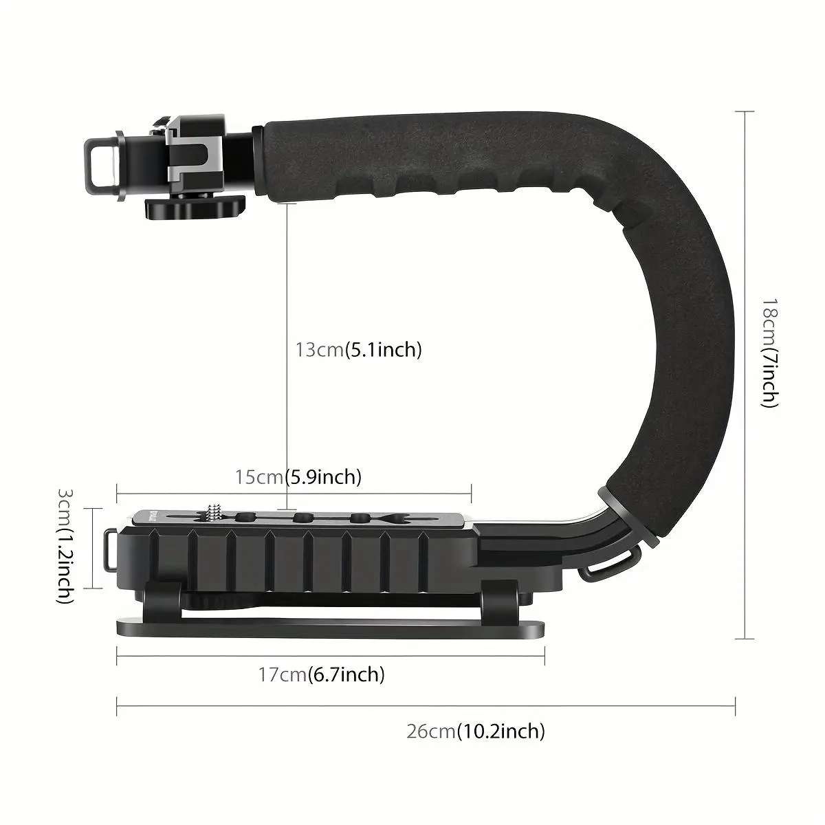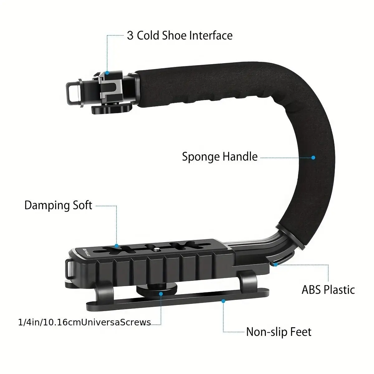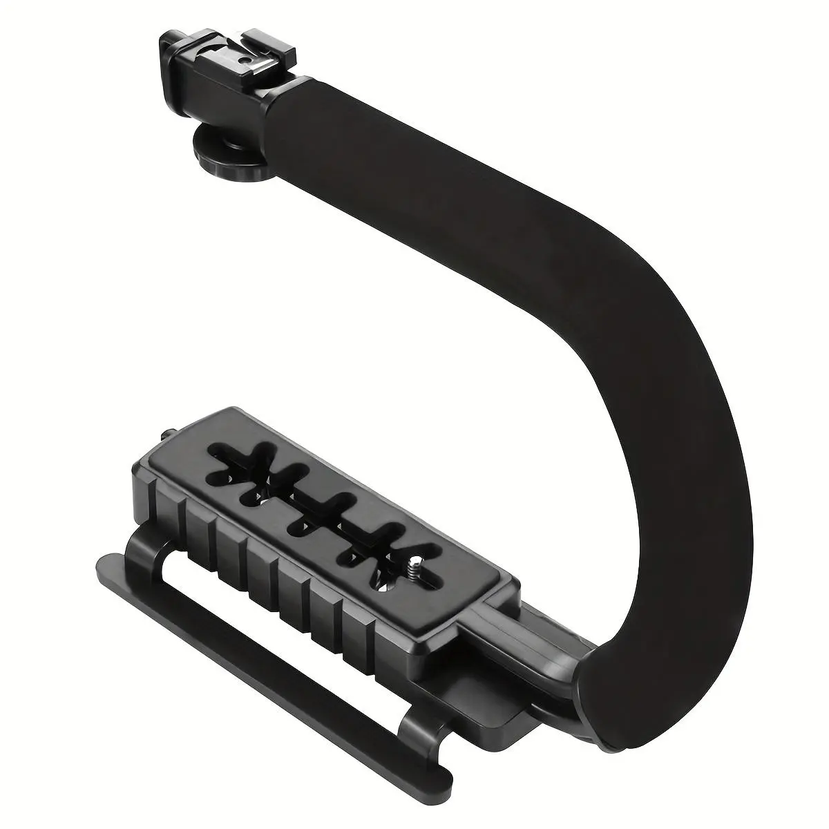 Ever struggled with shaky footage while filming your adventures? This U/C Shape Portable Handheld DV Bracket Stabilizer is here to save your videos! Designed with an ergonomic grip, it lets you hold steady shots comfortably for longer without tiring your hands. Its lightweight, travel-friendly build means you can take it anywhere—from city streets to nature trails—capturing smooth, professional-looking clips on the go. The adjustable bracket fits your smartphone, camera, or camcorder perfectly, while three cold shoe mounts let you add lights, microphones, or other accessories for a full vlogging setup. Made from durable ABS plastic with a soft sponge handle and non-slip feet, this rig stabilizes your shots and keeps your gear secure. Whether you're shooting action scenes, travel vlogs, or family moments, this multifunctional stabilizer makes video recording easy and fun. Ready to upgrade your filming game? Grab this versatile rig and start capturing steady, stunning footage today!